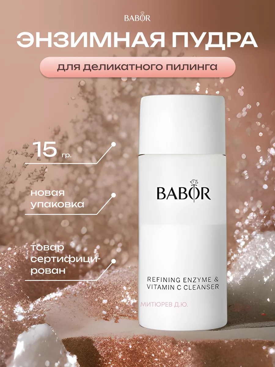 НОВИНКА BABOR refining enzyme & vitamin c cleanser Бестселлер в очищении с максимально экономичным использованием. Тонкодисперсная пудра с витамином С и ферментами для очищения и пилинга кожи любого типа. Выравнивает тон. Восстанавливает свежесть и сияние. Предотвращает преждевременное старение кожи, вызываемое свободными радикалами. Результат: устраняет жирный блеск, эффективно отбеливает кожу, осветляет пигментные пятна, выравнивает микрорельеф, безукоризненно чистая сияющая кожа, ровный тон, мелкие поры. Энзимная пудра разработана для глубокого очищения кожи от излишков себума, омертвевших клеток, пыли и остатков косметических средств. Нежная текстура, не повреждает кожу, обеспечивает ощущение чистоты и комфорта. Babor Enzyme Cleanser Тонкодисперсная пудра с витамином С и ферментами для очищения и пилинга кожи любого типа. Выравнивает тон Восстанавливает свежесть и сияние Предотвращает преждевременное старение кожи, вызываемое свободными радикалами. Результат: безукоризненно чистая сияющая кожа, ровный тон, мелкие поры. При вспенивании с водой обеспечивает интенсивное, но при этом щадящее очищение. Витализирует кожу за счёт мягкого эффекта пилинга. Интенсивно очищает, придаёт коже импульс к регенерации обновлению. Насыпьте необходимое количество рассыпчатой пудры на ладонь и вспеньте с водой до получения консистенции мусса. Тщательно распределите по лицу, шее и декольте. Смойте обильным количеством воды. Ферментную Пудру можно использовать курсом, например, в рамках одной недели в качестве ежедневного очищающего средства. В этом случае мы рекомендуем использовать Ферментную пудру по утрам, а вечером выбрать другой продукт, например, Гидрофильное Масло, так как Ферментная Пудра не подходит для снятия макияжа. Применение Ферментной Пудры рассыпчатой курсом будет особенно полезно для кожи, склонной к неровностям, высыпаниям или пигментации. В качестве нежного пилинга применяйте Ферментную Пудру 1–2 раза в неделю.