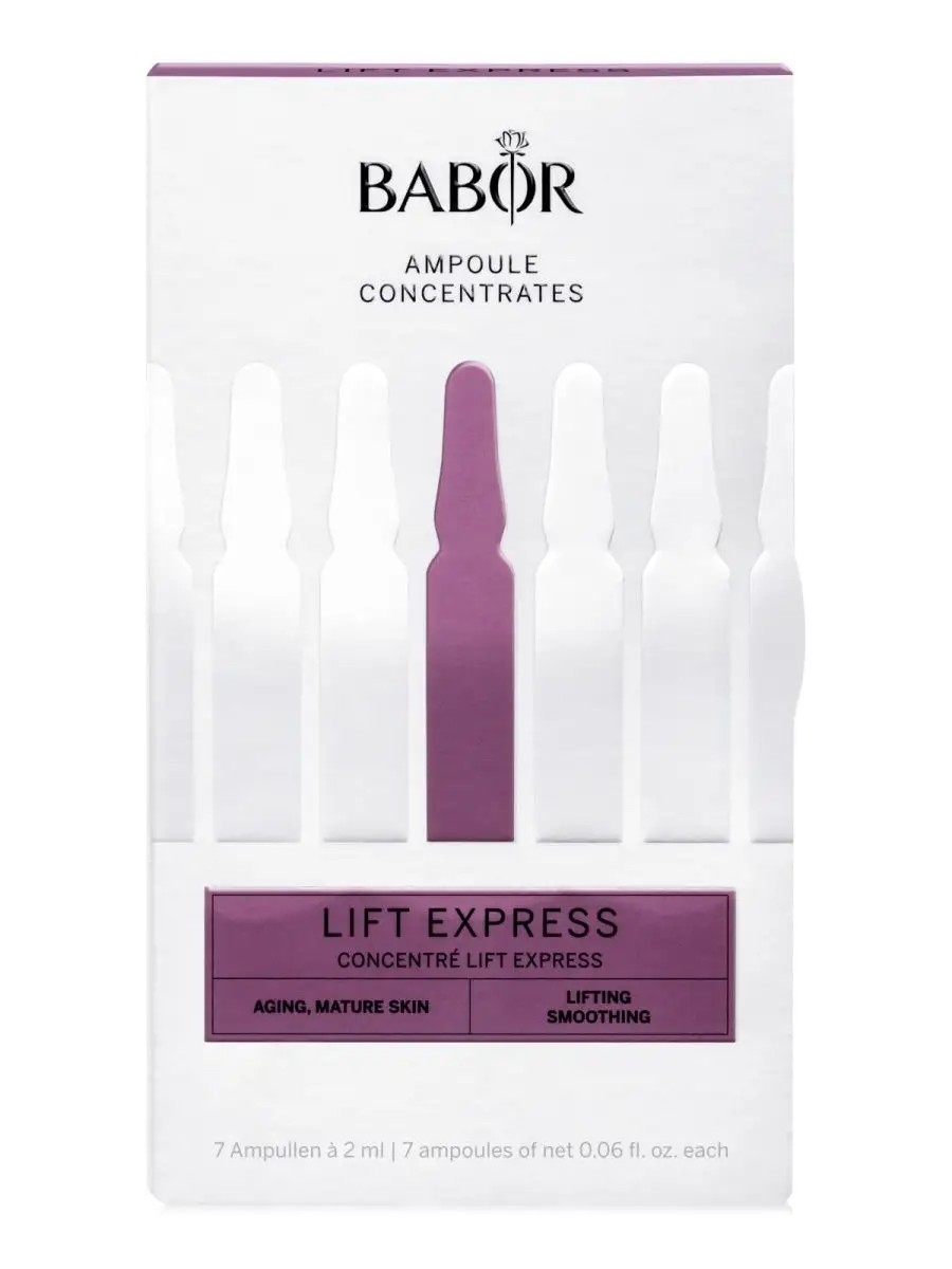 Babor's Express Lift Ampoule Set is an instant wrinkle-correction concentrate for reducing the depth of gravitational and expression wrinkles. It reduces wrinkle depth by up to 58%, corrects the depth of nasolabial folds, provides a pronounced lifting effect, and improves skin microrelief thanks to the Express Lifting complex, which consists of red algae extract combined with a neuropeptide. This complex instantly provides an optical reduction in wrinkle depth and increased tissue density. Sorbitol provides hydration and betaine has a soothing effect. Apply the contents of the ampoule to cleansed skin morning or evening. Shake the ampoule before use. To open, wrap the neck of the ampoule with a cosmetic tissue or use the special plastic tool included with the packaging. After application, wait a short while and then apply the cream. One ampoule concentrate is intended for single use. Attention! Due to a change in the box design, the product may be in new packaging (a white box without film) and in old packaging (a black box with film).