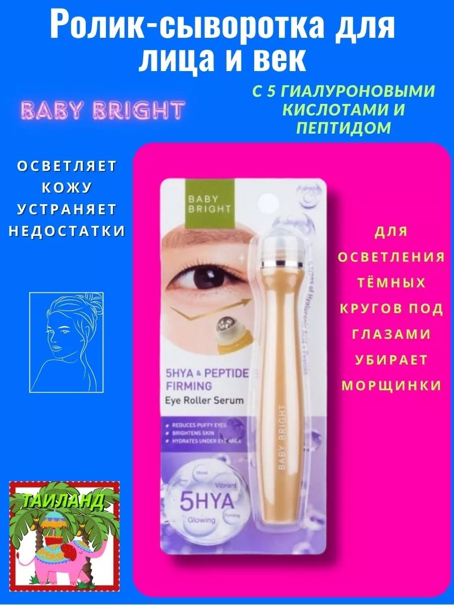 5HYA&Peptide Eye Roller Serum with Peptides and 5 Types of Hyaluronic Acid, 15 ml, by BABY BRIGHT, Thailand - This peptide firming serum effectively reduces dark circles and leaves skin looking radiant. The skin around the eyes is 10 times thinner than the rest of the body, making it particularly susceptible to daily damage from the sun and air pollution. It is almost completely devoid of subcutaneous fat and is prone to early signs of aging. This roller, specially designed for massaging the under-eye area, is enriched with 5 types of hyaluronic acid, which helps minimize wrinkles while deeply hydrating delicate skin. A cocktail of five types of hyaluronic acid molecules provides deep and long-lasting hydration. It hydrates and firms the skin, reducing signs of aging and puffiness. Palmitoyl Tetrapeptide-7 is a synthetic peptide based on amino acids. It effectively delays the signs of premature skin aging, stimulates collagen synthesis, and prevents its destruction to prevent and reverse wrinkles around the eyes. It additionally moisturizes and protects the skin, improves its elasticity and firmness, restores and strengthens, and reduces inflammation and its consequences. Your eyes become more expressive, and your gaze more open. The roller shape ensures economical use. When applied, thanks to a gentle massage effect, blood flows better to the tissues, saturating them with oxygen, and the product's components are absorbed more actively. The light texture does not leave a greasy or sticky residue and does not roll under makeup. Suitable for all skin types, including sensitive skin. Recommended age: 30+. HOW TO USE: Unscrew the cap and roll the roller around your eyes. Then gently tap the serum with your fingers until it is absorbed.