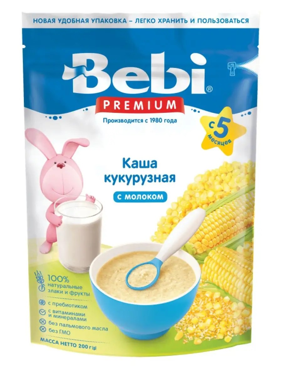 Детская каша Bebi Premium кукурузная с молоком 200 гр для детей с 5 месяцев. Кукурузная каша с молоком – приятное и сытное разнообразие на столе малыша. Приготовить самостоятельно кукурузную кашу так, чтобы ребенок ел с удовольствием – непросто. Гораздо удобнее довериться профессионалам Bebi Premium. Их кукурузную кашу легко приготовить. Кашка мгновенно приобретет однородность без комочков. Натуральный состав каши дополнен 13 витаминами и 4 минералами для здорового роста и гармоничного развития малыша. Пребиотик инулин обеспечивает оптимальное пищеварение, стимулируя выработку полезной микрофлоры в кишечнике. Каша изготовлена с применением натуральных злаков и фруктов, без ГМО, пальмового масла, консервантов и красителей. Рекомендации или ограничения по использованию: К 150 мл кипячённой воды, охлаждённой до 50-60 °С добавить 30 г (4-5 столовых ложек) хлопьев. Перед употреблением перемешать. Для кормления используйте только свежеприготовленный продукт. После каждого использования тщательно закрывайте пакет. Следуйте инструкции для приготовления порции продукта. Условия хранения: В сухом прохладном месте при температуре не выше +25 °С и относительной влажности воздуха не более 75%.