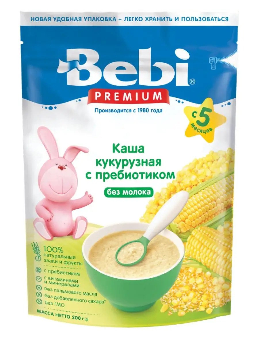Детская каша Bebi Premium кукурузная с пребиотиками без молока 200 гр для детей с 5 месяцев. Безмолочная низкоаллергенная кукурузная каша для первого прикорма Bebi Premium - прекрасный выбор первого блюда прикорма в рационе питания малыша старше 5 месяцев. Эта каша не содержит сахар, молоко и глютен – самые частые виновники аллергии на первом году жизни. Еще одним преимуществом этой каши, является обогащенный состав: пребиотики отвечают за здоровье кишечника и укрепляют иммунную защиту, а витаминно-минеральный премикс способствует процессам нормального физического и нервно-психического развития ребенка. Для разведения каши можно использовать сцеженное мамино молоко, адаптированную или специальную смесь, которую получает ребенок, овощной отвар. Рекомендации или ограничения по использованию: К 150 мл кипячённой воды, охлаждённой до 50-60 °С добавить 20 г (3-4 столовых ложек) хлопьев. Перед употреблением перемешать. Для кормления используйте только свежеприготовленный продукт. После каждого использования тщательно закрывайте пакет. Следуйте инструкции для приготовления порции продукта. Условия хранения: В сухом прохладном месте при температуре не выше +25 °С и относительной влажности воздуха не более 75%.