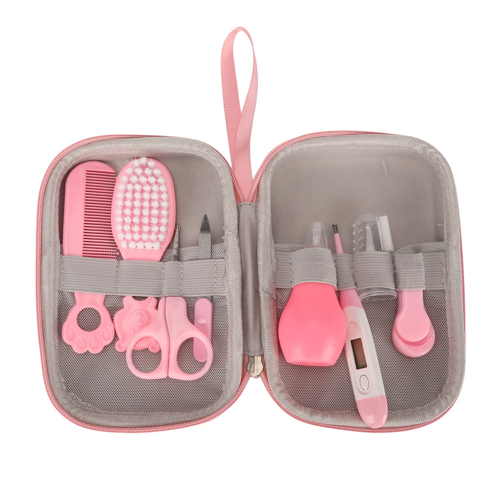 Specification: Item Type: Baby Healthcare Grooming Kit Material: Plastic Quantity: 8pcs Color: Pink Thermometer Battery Type: 1 x LR41 Battery Thermometer Battery Capacity: 40mah(Included) Package List: 1 x Storage Bag 1 x Nasal Suction Tool 1 x Comb 1 x Brush 1 x Nail Clippers 1 x Nail File 1 x Thermometer 1 x Silicone Toothbrush 1 x Scissors