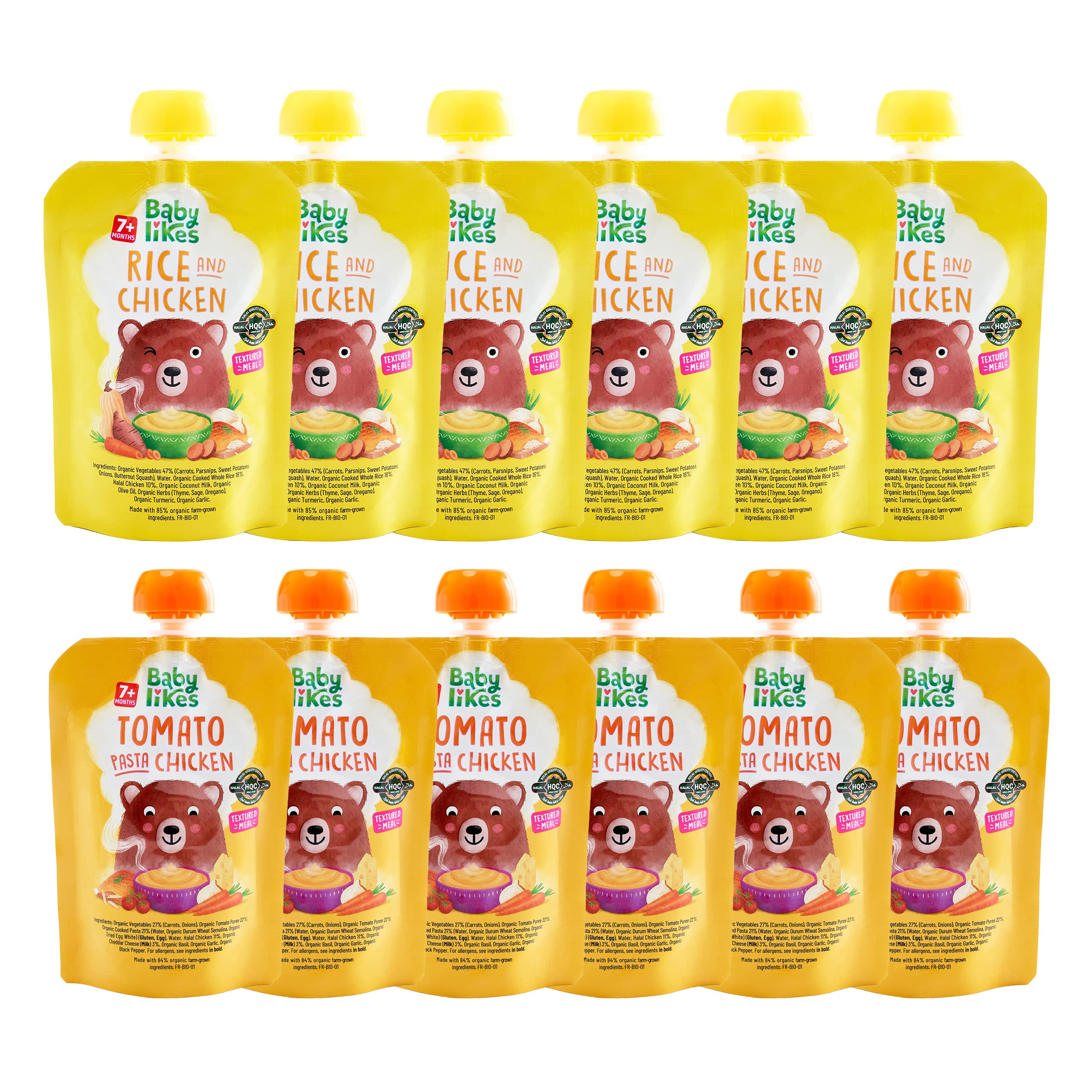 Baby Likes Halal Tomato Pasta Chicken 6 pouches x 130 grams and Rice and Chicken 6 pouches x 130 grams - Textured Meal for Stage 2 Weaning for 7 months plus