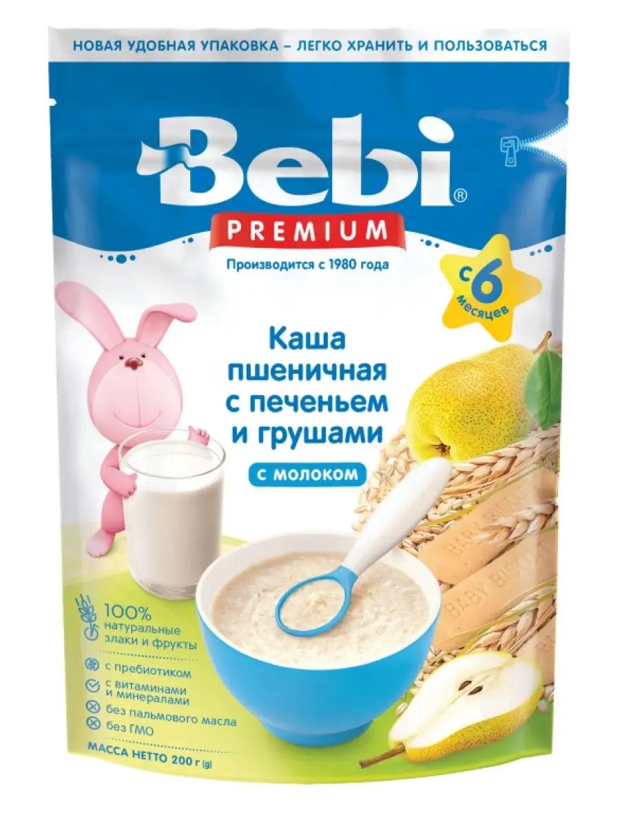 Детская каша Bebi Premium пшеничная с печеньем и грушами с молоком 200 гр для детей с 6 месяцев. Пшеничная, молочная, сухая, быстрорастворимая Каша Bebi Premium для полдника печенье с грушами предназначена для кормления детей в возрасте от 6 месяцев. Каша для полдника включает в себя все обязательные для полдника компоненты в самом аппетитном и полезном сочетании: печенье, молоко и натуральное фруктовое пюре. Груша – хорошо усваиваемый фрукт даже детьми-аллергиками. Содержит витамины группы В и провитамин витамина А. Полдник, как важный прием пищи, обязан восполнять энергетические траты организма, снимать утомление и психоэмоциональное напряжение во второй половине дня. Поэтому должен включать в себя: белки, жиры, углеводы (молоко, фрукты и зерновые блюда). Каши Bebi обогащены 12 витаминами, железом и йодом, что позволяет провести профилактику железодефицитных состояний и дефицита йода, способствовать развитию интеллекта ребенка. Каши не содержат искусственных ароматизаторов, красителей, консервантов, генетически модифицированных компонентов. Рекомендации или ограничения по использованию: К 150 мл кипячённой воды, охлаждённой до 50-60 °С добавить 35 г (4-5 столовых ложек) хлопьев. Перед употреблением перемешать. Для кормления используйте только свежеприготовленный продукт. После каждого использования тщательно закрывайте пакет. Следуйте инструкции для приготовления порции продукта. Условия хранения: В сухом прохладном месте при температуре не выше +25 °С и относительной влажности воздуха не более 75%.