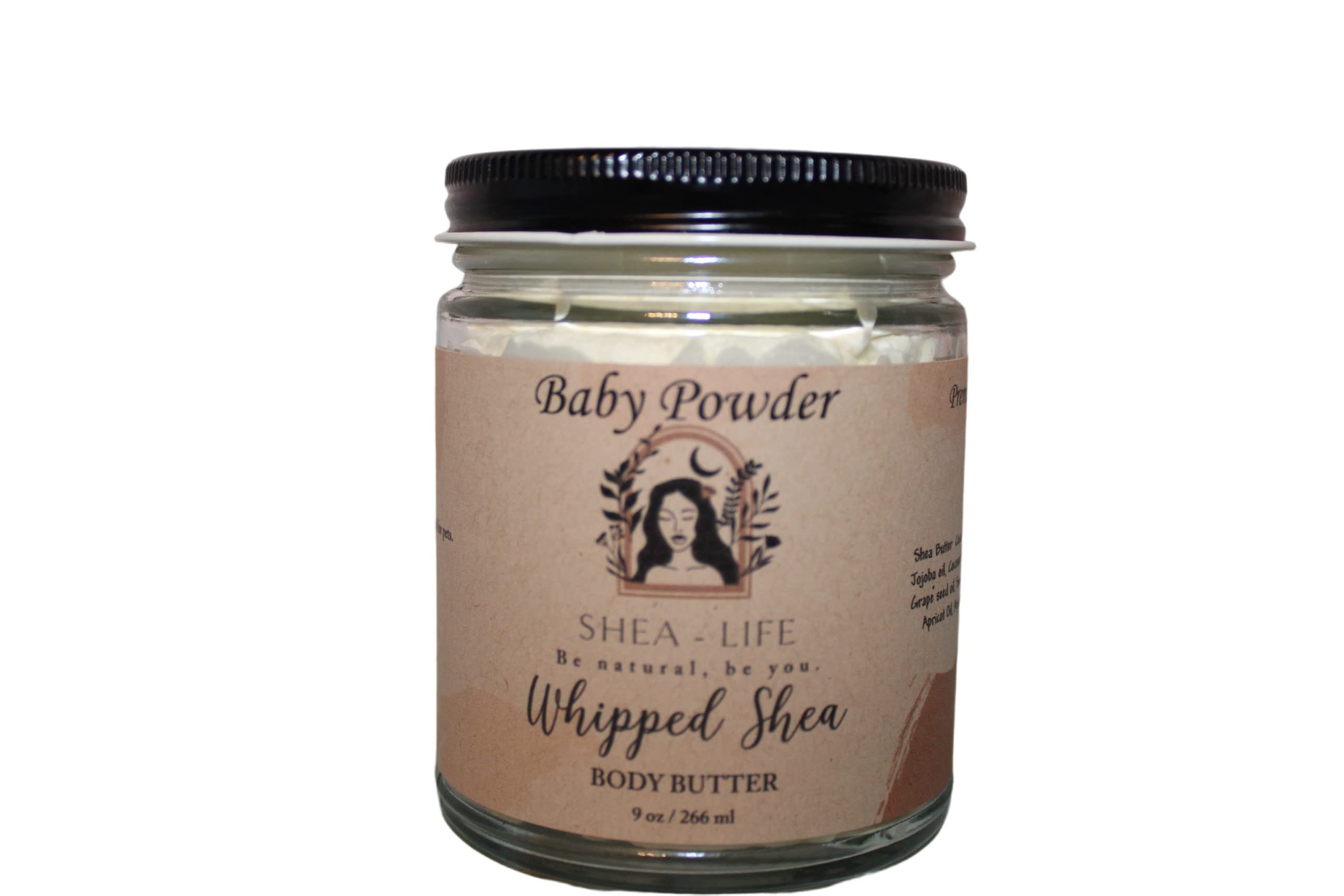 Baby Powder Whipped Body Butter Premium Blend. The Baby Powder Whipped Body Butter is the classic clean scent that is so easily recognizable. Feel pampered after a bath or shower with this super moisturizing and all-natural body butter. You will feel as smooth as a baby's. Handmade and comes in a 9 oz. Jar. Fresh Baby Powder Scent, All-Natural Ingredients. During warm weather, products may soften or even melt as they sit in warm mail trucks, mailboxes, or on front porches. The quality and healing properties of our products are not affected by melting. On very sunny or warm days, BEFORE opening the jars or tins, place the items in your refrigerator for a few hours to allow them to harden, just in case they have melted in transit. If you open items, especially those in tins, to check if melting has occurred, they may spill and make a mess! Whipped Body Butters Place a melted body butter in the refrigerator until firm. Our hand-whipped process adds tiny air bubbles that increase the volume, just like whipping cream. If a whipped product melts, the air bubbles collapse and the volume is decreased. So, although the jar was filled to the top initially, there will be less volume in the container (since it has deflated) and the container may actually look half full. After cooling a melted Whipped Butter will be the consistency of our body balm and is still a great moisturizer.