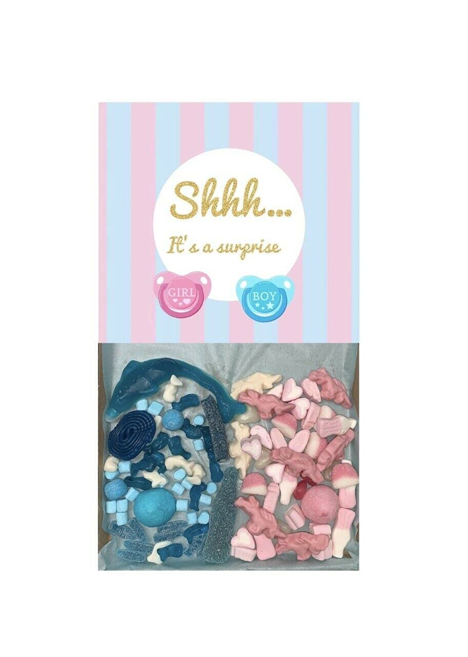 Handmade pick n mix style hamper of yummy pink assortment sweets 300g The hamper comes tied with Pink matching ribbon! The sweets in each hamper will be sealed inside a plastic bag to ensure that they arrive freshly and safely. The product photo shows 300g of sweets - exact quantities and style of sweets may vary. Not suitable for vegetarians Please note: These sweets are assembled in an area that handles WHEAT, GLUTEN, SOYA, MILK, PEANUTS, NUTS other allergens. This makes the perfect gift for Baby Shower but please view the shop for any occasion :- Fathers Day, Easter, Birthday, Christmas stocking filler, Secret Santa, Passing driving test, Quiz winner, Employee of the month, Well Done, Congratulations, Thank You, Get Well, Thinking Of You, Valentines Day, Movie Night, New Parents, Leaving Gift, New Job, Passing exams, Best Teacher, Miss you , Love You, Movie Night, or A yummy treat for yourself or just to show your appreciation to your loved ones! The Brown Box Measures 220mm x 190mm x 19mmGreat Pink Blue Sweet Box. Tied with Pink Blue Ribbon. An ideal gift that can be sent directly to the recipient!. Idea gift for Baby Shower Or Gender Reveal. 300g Blue Pink pick n mix.