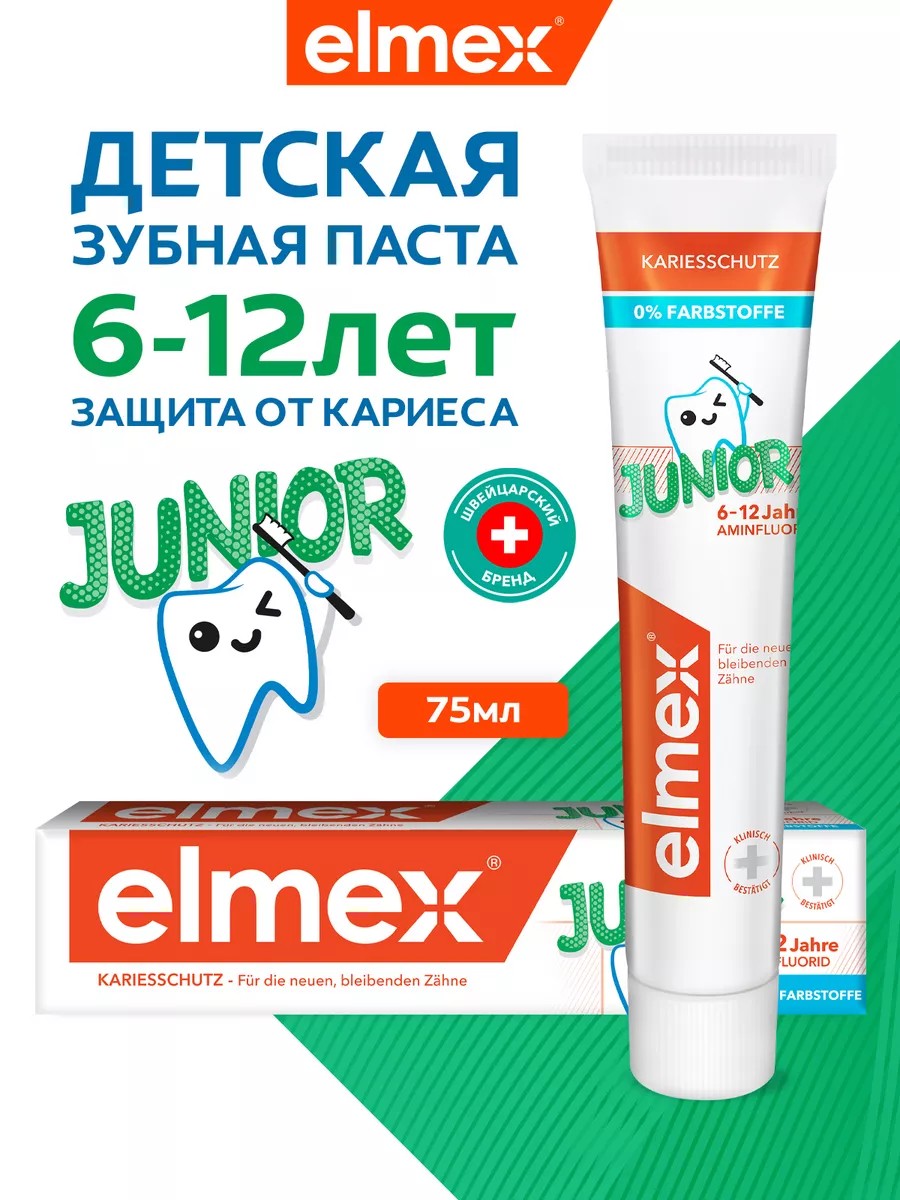 Elmex Junior зубная паста с фтором для детей в возрасте от 6 до 12 лет обеспечивает эффективную защиту от кариеса и укрепление только прорезавшихся постоянных зубов вашего ребенка.