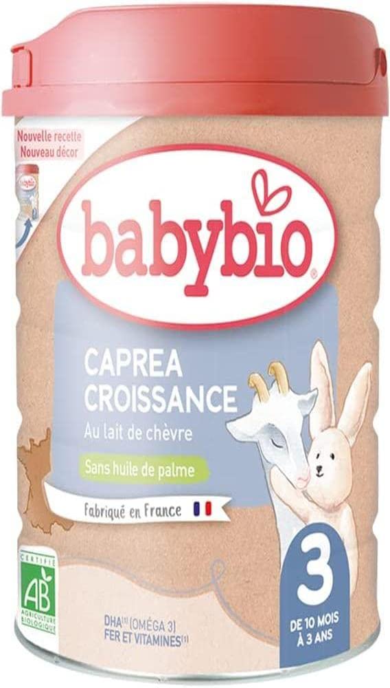 Feeding your baby is a unique moment that combines bonding, tenderness, and sharing. Thanks to our Caprea Growth recipe, which is also suitable as a supplement to breastfeeding, you can serenely enjoy this bottle-feeding time with your baby from 10 months to 3 years old. There's nothing better than a Growth recipe made with good organic goat's milk, produced in France, and completely palm oil-free to delight your baby up to 3 years old. And the added bonus of Caprea Growth? We guarantee fair compensation for our partner farmers and we work with committed farmers who respect animal welfare (access to the outdoors whenever weather conditions allow, feeding primarily with forage from the farm, etc.). Did you know? We are a French SME, a pioneer in organic infant nutrition and the creator of the first French organic infant formula for babies. For over 25 years, our passionate nutrition teams have dedicated their expertise to the well-being of little ones, allowing you to enjoy feeding time with complete peace of mind. IMPORTANT NOTICE: This product is only suitable for the specific nutritional needs of infants aged at least 6 months and should only be one component of a varied diet. The introduction of complementary foods, even before 6 months of age, should only be done on the advice of a healthcare professional. Follow-on milk cannot be used as a substitute for breast milk during the first 6 months of life. INGREDIENTS INGREDIENTS: Whole goat's milk powder from the Netherlands (36.4 ), corn maltodextrin , goat's lactose , vegetable oils [high oleic sunflower , rapeseed , sunflower ) Minerals (calcium citrate, sodium citrate, calcium phosphate, iron pyrophosphate, potassium citrate, zinc sulfate, sodium chloride, sodium selenite, copper sulfate, potassium phosphate, magnesium sulfate, potassium chloride, manganese sulfate, potassium iodide): fish oil L-tyrosine vitamins (C, E, D, A, B1, B5, B8, B12, B2, B1, K, B6, B9) L-leucine L-isoleucine L-guisine L-tryptophan antioxidant: tocopherol-rich extract. Ingredients from organic farming. May contain soy and cow's milk protein. INSTRUCTIONS FOR USE Pour the required amount of warmed water (maximum 40 C) and the correct number of scoops into the bottle (previously cleaned and sterilized). Close and shake the bottle vigorously. Check the temperature on the inside of your wrist. SAFETY WARNING Wash your hands before each preparation. The bottle should be prepared just before feeding. Discard any leftover formula without hesitation. Use only the scoop provided in this box. Be sure to close the box tightly after each use. See moreBabybio caprea 3 croissance lait de chèvre 3ème âge 800gDESCRIPTION DU PRODUIT DESCRIPTION DU PRODUIT Nourrir votre bébé est un moment unique qui allie complicité, tendresse et partage. Grâce à notre recette Caprea Croissance, qui convient aussi en relais et ou en complément de l'allaitement, profitez sereinement de ce moment biberon avec bébé dès 10 mois et jusqu'à ses 3 ans. Rien de mieux qu'une recette Croissance à base de bon lait de chèvre bio, fabriquée en France, et le tout sans huile de palme pour régaler bébé jusqu'à ses 3 ans. Et le petit plus de Caprea Croissance ? Nous garantissons la juste rémunération de nos éleveurs partenaires et nous travaillons avec des agriculteurs engagés qui respectent le bien-être animal (accès au plein air dès que les conditions météo le permettent, nourries majoritairement avec des fourrages issus de la ferme, etc.) Le saviez-vous ? Nous sommes une PME française, pionnière de l'alimentation infantile bio et à l'origine du 1er lait infantile bio français pour bébé. Depuis plus de 25 ans, nos équipes passionnées de nutrition ont su mettre toutes leurs expertises au service des tout-petits pour que vous puissiez profiter du moment biberon en toute sérénité. AVIS IMPORTANT : ne convient qu'à l'alimentation particulière des nourrissons ayant atteint l'âge d'au moins 6 mois et ne peut être qu'un élément d'une alimentation diversifiée. L'introduction d'aliments de compléments y compris avant l'âge de 6 mois ne doit se faire que sur avis d'un professionnel de santé. Le lait de suite ne peut pas être utilisé comme substitut du lait maternel pendant les 6 premiers mois de la vie. INGRÉDIENTS INGRÉDIENTS : Poudre de LAIT entier de chèvre des Pays-Bas (36,4 ) maltodextrines de mais i LACTOSE de chèvre huiles végétales [tournesol oléique , colza , tournesol ) minéraux(citrate de calcium citrate de sodium, phosphate de calcium, pyrophosphate de fer citrate de potassium, sulfate de zinc, chlorure de sodium,selenite de sodium, sulfate de cuivre, phosphate de potassium, sulfate de magnésium, chlorure de potassium, sulfate de manganese, iodure de potassiuml: huile de POISSON: L-tyrosine vitamines[ C, E, D,A, B1, B5 B8,B12,B2, B1, K, B6, B9) L-leucine L-isoleucine L- guisine L- tryptophane antioxydant : extrait riche en tocophérols Ingredients issus de l'agriculture biologigue. Peut contenir du soja et des protéines de lait de vache MODE D'EMPLOI Versez dans le biberon (préalablement nettoyé et stérilisé) la quantité d'eau nécessaire tiédie à 40 C maximum et le bon nombre de mesurettes. Fermez et agitez vigoureusement le biberon. Vérifiez la température sur l'intérieur du poignet. AVERTISSEMENT DE SÉCURITÉ Lavez vous les mains avant chaque préparation. Le biberon doit être préparé juste avant le repas. Je tez tout reste de biberon sans hésiter. N'utilisez que la mesurette contenue dans cette boite. Veillez à bien refermer la boite entre chaque utilisation. Voir plus