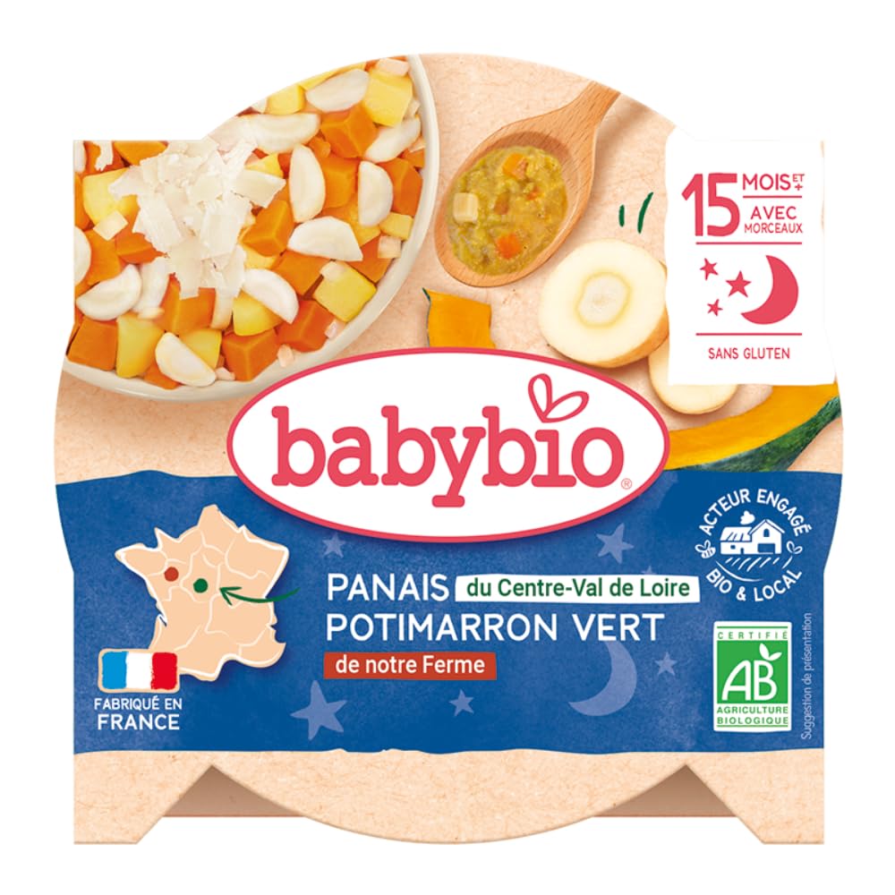: This recipe is a delight. Here's a lovely assortment of vegetables that will please your baby. Parsnips from the Loire Valley and butternut squash from the Drôme region blend perfectly to give this dish its full flavor. And because our little ones have a sweet tooth, Baby Bio has added a touch of cream and Parmesan cheese. Ingredients: Vegetables 82 (parsnips from the Loire Valley 53 , butternut squash from the Drôme region 15 , carrots from the Landes region 9 , onions from Spain ), cooking water, Parmesan cheese from Italy 2 , whole cream 2 , garlic from Spain . Ingredients from organic farming. Ingredients: Parsnips from the Centre-Val de Loire region 40 , cooking water, green pumpkin puree from our farm 15 , potatoes from our farm 14 , carrots from France 8 , onion puree from our farm 3 , Italian Parmesan cheese, French crème fraîche 2 , Spanish garlic, nutmeg. Ingredients from organic farming. Instructions: Simply prepare the dish and serve as is or warm it slightly. See moreWeight: 260 g. Organic. Made in France. Gluten-free. Allergens: milk.Description du produit Cette recette est une crème. Voici un joli assortiment de légumes qui va ravir bébé. Panais du Val de Loire et potimarron de la Drôme se mélangent à merveille pour donner à ce plat toute sa saveur., Et parce que nos petits sont gourmands, Baby bio a ajouté une pointe de crème et de parmesan. Ingrédients : Légumes 82 (panais du Val de Loire 53 , potimarrons de la Drôme 15 , carottes des Landes 9 , oignons d'Espagne ), eau de cuisson, parmesan d'Italie 2 , crème fraiche entière 2 , ail d'Espagne . Ingrédients issus de l'agriculture biologique. Ingrédients Panais du Centre-Val de Loire 40 , eau de cuisson, purée de potimarrons verts de notre Ferme 15 , pommes de terre de notre Ferme 14 , carottes de France 8 ,purée d'oignons de notre Ferme 3 , PARMESAN d'Italie, CREME fraiche de France 2 , ail d'Espagne, muscade. Ingrédients issus de l'agriculture biologique. P.when('A').execute(function(A) { A.on('a:expander:toggle_description:toggle:collapse', function(data) { window.scroll(0, data.expander. expander[0].offsetTop-100) }) }) Mode d'emploi Préparez simplement le plat et servez-le tel quel ou réchauffez-le légèrement. Voir plusPoids : 260 g. Biologique. Fabriqué en France. Sans gluten. Allergènes : lait.Babybio - Bonne Nuit - Assiette Gratin de Panais Potimarron du Val de Loire - 15 Mois et , BIO - 260 g Bonne Nuit 260 g (Lot de 1)