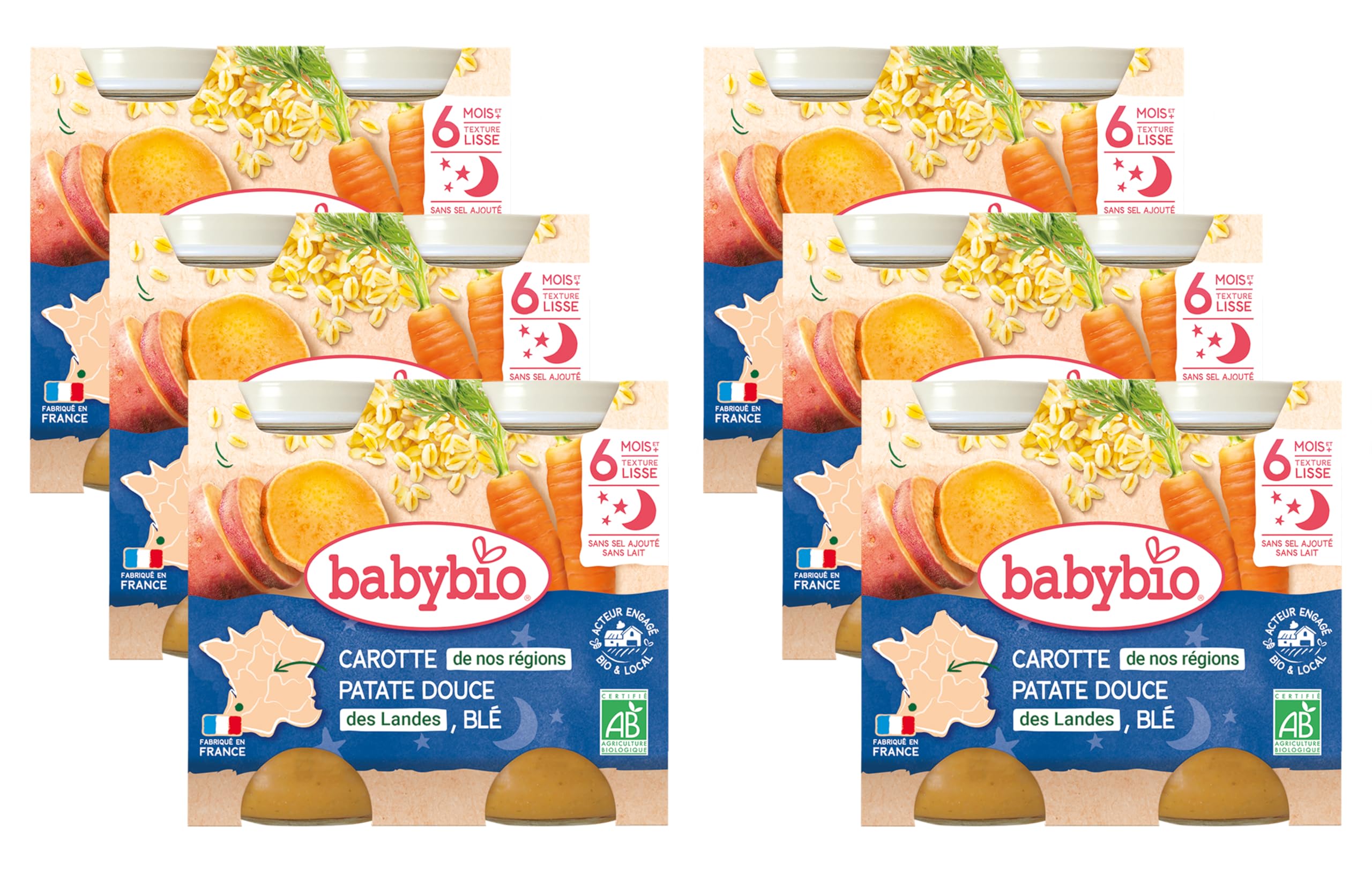 : Vegetables on a bed of wheat. Proof that vegetables don't need to be dressed up to parade in a carnival of flavors! Carrots from the Landes region, sweet potatoes and onions from our local areas, peppers, wheat, thyme from France… With this little jar, baby will have colorful dreams! Ingredients: Carrots 29 , cooking water, sweet potatoes 18 , peppers, WHEAT 7 , onions 7 , vegetable oils (rapeseed, sunflower), thyme. Instructions: Serve warm - Do not add salt. Store at room temperature before opening. When tightly closed, it can be kept in the refrigerator for 48 hours. See moreNo added salt, no milk, no gluten, and no thickeners. Organic product. Made in France. Allergens: Gluten.Description du produit Des légumes épi du blé. Voilà la preuve que les légumes n'ont pas besoin d'être déguisés pour défiler dans un carnaval de saveurs ! Carottes des Landes, patates douces et oignons de nos régions, poivrons, blé, thym de France… Avec ce petit pot bébé fera des rêves hauts en couleurs ! Ingrédients Ingredients: Carottes 29 , eau de cuisson, patates douces 18 , poivrons, BLE 7 , oignons 7 , huiles vegetales (colza, tournesol), thym P.when('A').execute(function(A) { A.on('a:expander:toggle_description:toggle:collapse', function(data) { window.scroll(0, data.expander. expander[0].offsetTop-100) }) }) Mode d'emploi Servir tiède - Ne pas ajouter de sel. Se conserve à température ambiante avant ouverture. Bien refermé, peut se conserver 48h au réfrigérateur. Voir plusSans sel ajouté, sans lait, sans gluten et sans épaississant. Produit Biologique. Fabriqué en France. France. Allergènes : Gluten.Babybio - Bonne Nuit - Petits Pots Carotte des Landes Patate Douce Blé 2x200g - PACK de 6 - 6 Mois - BIO