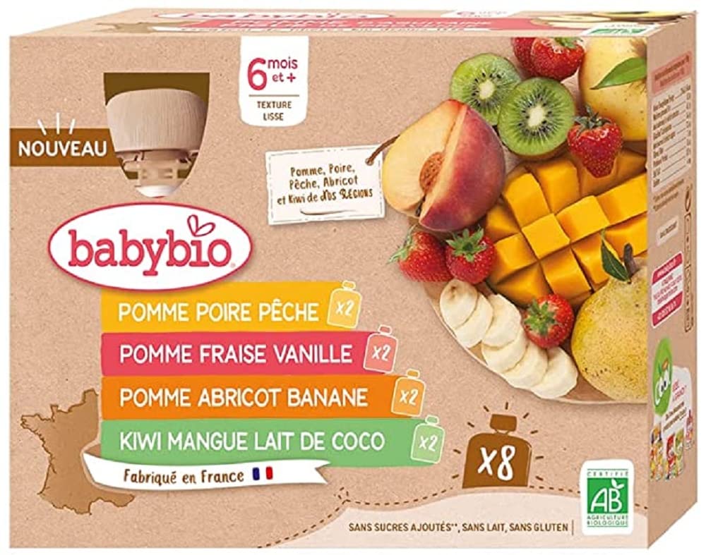 By choosing this multi-flavor pack, you no longer have to compromise. Treat your baby to these 4 delicious, varied, and fruity recipes. Your baby's taste buds will love discovering the taste of real fruit! The best part? The apples, kiwis, pears, apricots, and peaches come from our beautiful French regions. INGREDIENTS Apple Pear Peach: Apples from France 50 , pears from France 30 , peaches from Occitanie 20 . Apple Apricot Banana: Apples from France 55 , apricots from France 23 , bananas from Ecuador 22 . Apple Strawberry Vanilla: Apples from France 79.9 , strawberries from Spain 20 , Bourbon vanilla . Kiwi, Mango, Coconut: Kiwis from Nouvelle-Aquitaine 31 , mangoes from India 30 , apples from France 29 , coconut milk from Sri Lanka 10 (coconut , water). INSTRUCTIONS FOR USE None See more
