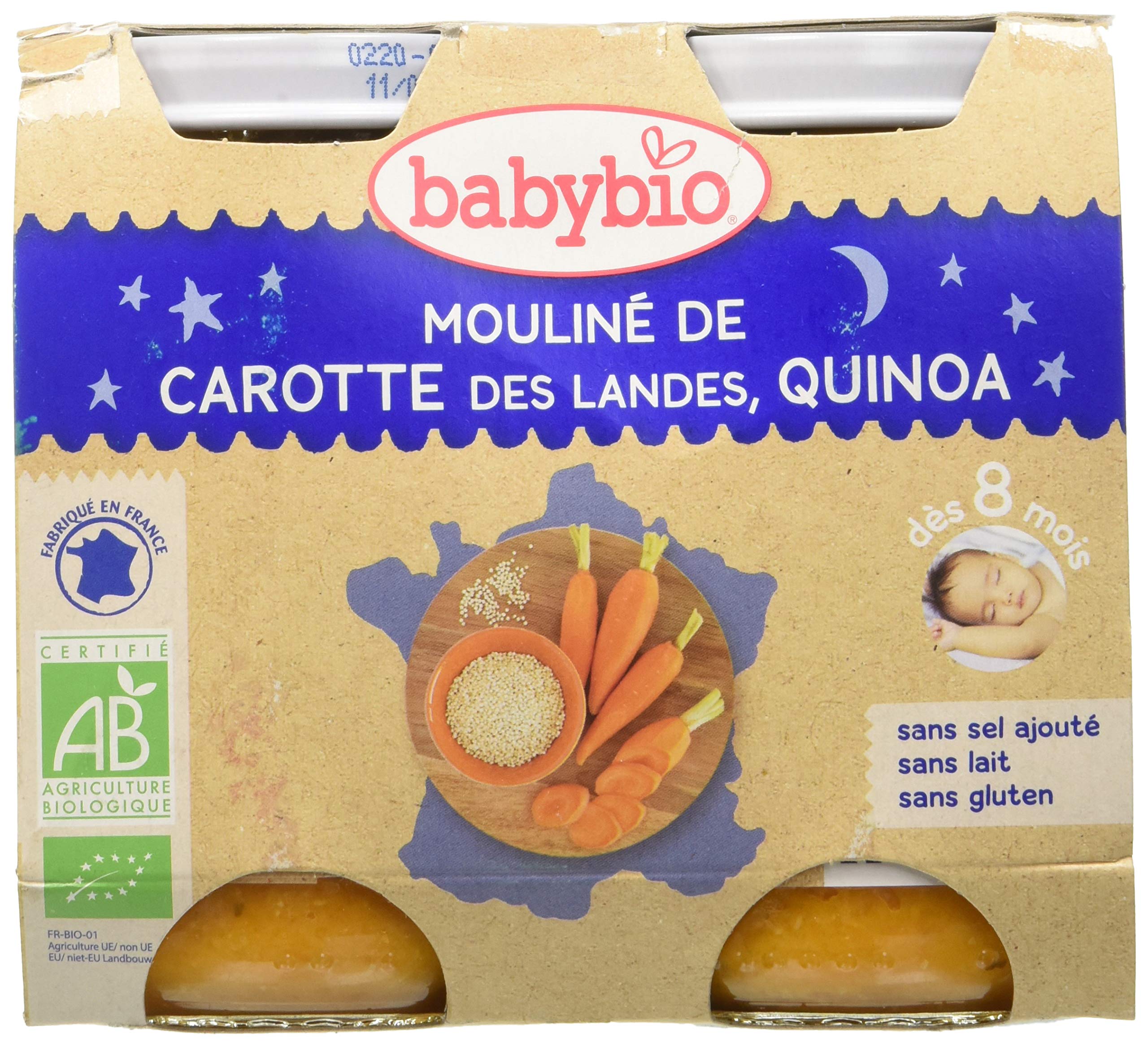 : This little pot is taking a bite out of the season. So many delicious flavors finally combined in one little pot. Carrots from the Landes region of France and sweet potatoes from Spain are coated in Italian tomato puree and accompanied by quinoa. With this combination of tastes, the Baby Bio producers have brought together all their expertise for baby's greatest pleasure. Ingredients: Vegetables 73 (carrots from the Landes region 48 , sweet potatoes from Spain 11 , tomato puree from Italy 8 , onions from Spain ), cooking water, quinoa 6 , vegetable oils (rapeseed , sunflower ), coriander from France . Ingredients from organic farming. Ingredients: Landes carrots 44.5 , cooking water, French sweet potatoes 12 , French onions 6 , quinoa 5.5 , Spanish peppers , vegetable oils (rapeseed , sunflower ), French coriander . Ingredients from organic farming. Average nutritional analysis per 100g: Energy 192 kJ 46 kcal Fat 1.2 g, of which saturates 0.1 g Carbohydrate 6.8 g, of which sugars 2.8 g Fiber 1.6 g Protein 1.1 g Salt 0.04 g Sodium 15 mgBabybio carrot quinoa puree from 8 months 2x200g - 3288131510552 - from Petits Pots Plats.Description du produit Petit pot en prend d'la graine. Tant de délicieuses saveurs enfin réunies dans un même petit pot. Carottes des Landes et patates douces d'Espagne s'enrobent de purée de tomates d'Italie et s'accompagnent de quinoa. Avec cette association de goûts, les producteurs Baby bio ont réuni tout leur savoir-faire pour le plus grand plaisir de bébé. Ingrédients : Légumes 73 (carottes des Landes 48 , patates douces d'Espagne 11 , purée de tomates d'Italie 8 , oignons d'Espagne ), eau de cuisson, quinoa 6 , huiles végétales (colza , tournesol ), coriandre de France . Ingrédients issus de l'agriculture biologique. Ingrédients Carottes des Landes 44,5 , eau de cuisson, patates douces de France 12 , oignons de France 6 , quinoa 5,5 , poivrons d'Espagne , huiles végétales (colza , tournesol ), coriandre de France . Ingrédients issus de l'agriculture biologique Analyse nutritionnelle moyenne Pour 100g Valeur énergétique 192 Kj 46 Kcal Matières grasses (g) 1,2 dont acides gras saturés (g) 0,1 Glucides (g) 6,8 dont Sucres (g) 2,8 Fibres (g) 1,6 Protéines (g) 1,1 Sel (g) 0,04 Sodium (mg) 15Babybio mouliné de carotte quinoa dès 8 mois 2x200g - 3288131510552 - de Petits Pots Plats.Babybio mouliné de carotte quinoa dès 8 mois 2x200g