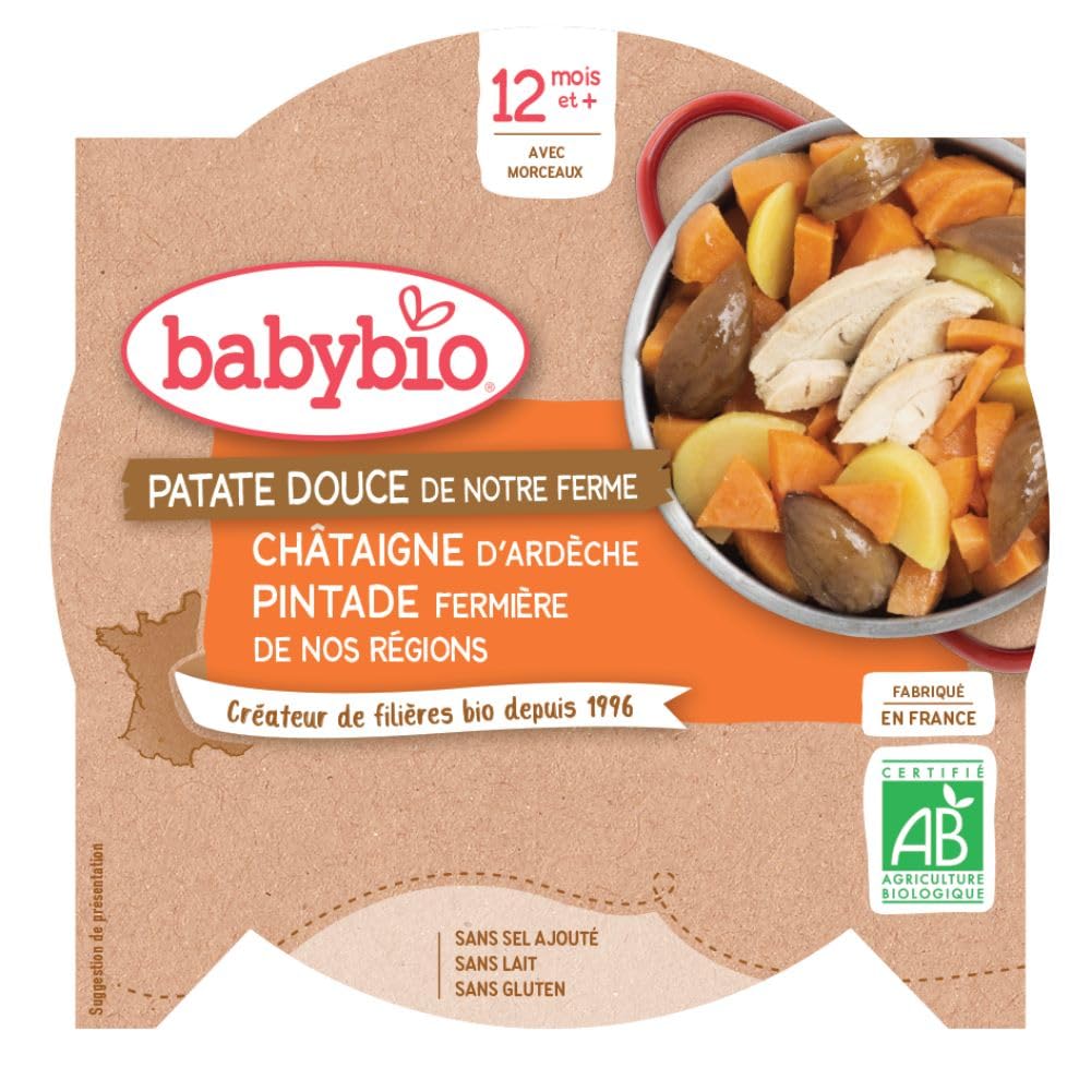 : A recipe with a twist! With its slightly sweet taste, the Spanish sweet potato pairs wonderfully with the Ardèche chestnut and its cousin, the Loire Valley potato. To delight baby, Babybio has added free-range guinea fowl from Poitou. Yum! Ingredients: Sweet potatoes from France 43 , potatoes from our farm 14 , Ardèche chestnut puree 12 (Ardèche chestnut 8.4 , water), cooking water, free-range guinea fowl meat from France 8 , apples from Nouvelle-Aquitaine 6 , onion puree from our farm 5 , vegetable oils (rapeseed , sunflower ). Ingredients from organic farming. P.when('A').execute(function(A) { A.on('a:expander:toggle_description:toggle:collapse', function(data) { window.scroll(0, data.expander. expander[0].offsetTop-100) }) }) Instructions for use: Do not use in a conventional oven. To heat in a bain-marie: Immerse the bowl in boiling water for approximately 5 minutes. Rinse with cold water, wait a moment, then remove the lid. To microwave: Pierce the lid and heat for 1 minute at medium power. Stir well and check the temperature before feeding your child. Do not add salt. The tightly sealed bowl can be stored in the refrigerator for 48 hours. See moreMade in France. Organic. Gluten-free. Dairy-free. No added salt.Description du produit Une recette qui a la cota-cotte ! Avec son petit goût sucré, la patate douce d'Espagne se marie à merveille avec la châtaigne d'Ardèche et sa cousine la pomme de terre du Val de Loire. Pour régaler bébé, Babybio y a rajouté de la pintade fermière du Poitou. Miam ! Ingrédients Patates douces de France 43 pommes de terre de notre Ferme 14 , purée de CHATAIGNE d'Ardèche 12 (CHATAIGNE d'Ardèche 8,4 eau), eau de cuisson, viande de pintade fermière de France 8 , pommes de Nouvelle-Aquitaine 6 , purée d'oignons de notre Ferme 5 , huiles végétales (colza , tournesol ). Ingrédients issus de l'agriculture biolagique. P.when('A').execute(function(A) { A.on('a:expander:toggle_description:toggle:collapse', function(data) { window.scroll(0, data.expander. expander[0].offsetTop-100) }) }) Mode d'emploi Ne pas mettre au four traditionnel Au bain marie : Plonger le bol environ 5 minutes dans l'eau bouillante. Arroser avec de l'eau froide, attendre un instant puis retirer l'opercule. Au micro-ondes : Percer l'opercule et chauffer 1 min à puissance moyenne. Bien remuer et vérifier la température avant de donner à votre enfant. Ne pas ajouter de sel. Le bol bien refermé hermétiquement se conserve 48h au réfrigérateur. Voir plusFabriqué en France. Biologique. Sans gluten. Sans lait. Sans sel ajouté.Babybio patate douce de notre ferme châtaigne d'Ardèche pintade 230g Midi 230 g (Lot de 1) Patate Douce, Chataîgne Pintade