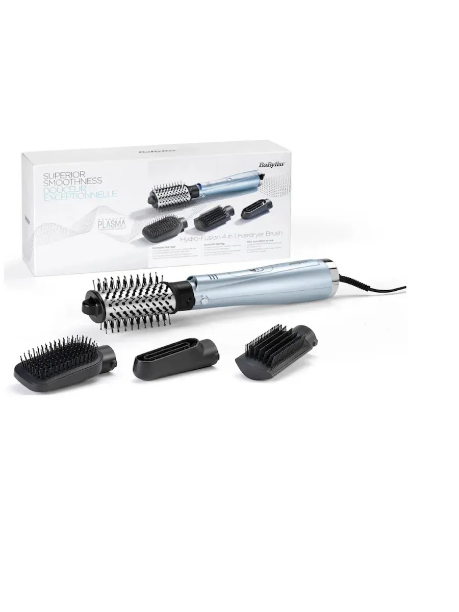 BaByliss, AS774E Hair Dryer Brush 1000 W, 1 pc. The BaByliss Hydro-Fusion 4-in-1 hair dryer brush dries and styles hair simultaneously. It has 4 interchangeable attachments for drying, smoothing, straightening, and adding volume and shape. This styler is ideal for fine, unruly, or curly hair. Hydro-Fusion technology in the hair dryer, which combines positive and negative ions, moisturizes hair and eliminates frizz during drying and styling. Hair becomes silky and conditioned with luxurious shine. The AS774E multi-styler has 4 interchangeable attachments for drying, smoothing, straightening, and creating volume and shape. The diameter of the main attachment is 55 mm.