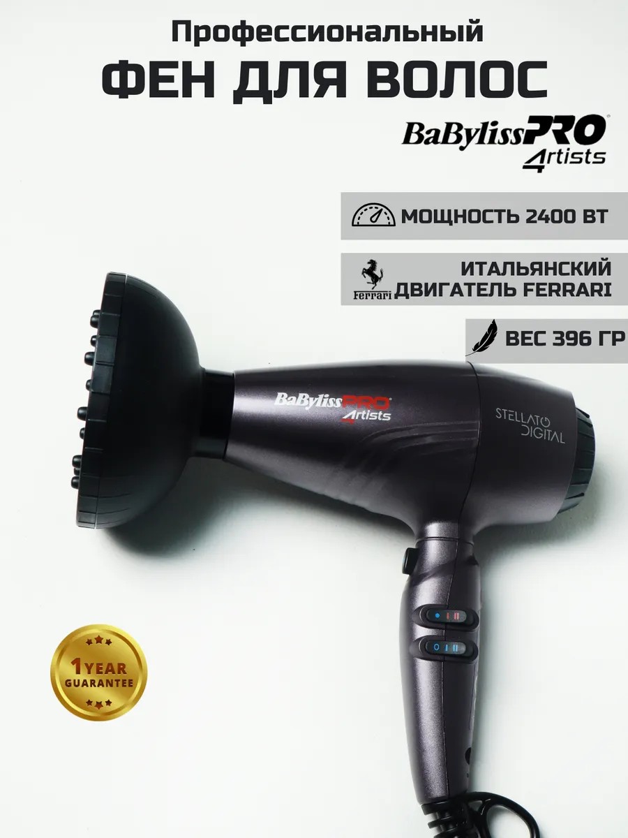 Профессиональный парикмахерский мощный фен с насадками и диффузором для укладки волос Babyliss Pro Stellato Digital ARTISTS BAB7500IE с ионизатором - самый надежный легкий и стильный инструмент бейбилиз созданный для профессионалов работающих в салонах красоты и барбершопах. Смещенный центр тяжести Baby liss стелато, электронно-цифровой мотор и маленький вес бэбелис создает комфортные условия для использования. Итальянский двигатель обладает максимальной мощностью и сделает процесс высушивания кудряшек наиболее быстрым. Бесшумная модель с ионизацией Бэбилисс Про BAB 7500 IE со сниженной к минимуму вибрацией супер легкая, что дает возможность держать ее без усталости рук долгое время при сушке кудрявых локонов. Большое количество скоростей и температуры стайлера бейбелиз позволяют выбрать необходимую именно вашему типу шевелюры. На корпусе находится турбо-кнопка для увеличения обдува и кнопка с холодным воздушным потоком. Генератор ионов babylispro снижает поверхностное статическое напряжение, делая пряди гладкими и послушными, придавая им силу и блеск, не пересушивая их. В комплект babylis идут 3 насадки: с узким и широким соплом с эффектом "Вентури", которые равномерно концентрируют струю воздуха при выпрямлении, двойная насадка-концентратор «Double Air» для создания объема по корням, круглая насадка-диффузор для бережной завивки волн и кудрей не выходя из дома. Оригинальный подарок babylispro стилисту или барберу, маме, бабушке, жене, сестре, подруге на День рождения, юбилей или на любой праздник