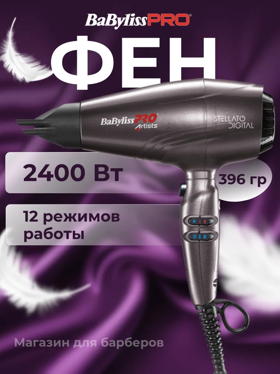 Фен для волос BaByliss PRO STELLATO DIGITAL 4ARTISTS. Мощный и долговечный электронно-цифровой мотор Ferrari EDM TECHNOLOGY 2400 Вт обеспечивает высокую скорость вращения - 22 800 оборотов в минуту, скорость потока воздуха 208 км/ч и давление 1860 Па. А также гарантирует срок службы до 10 000 часов.
