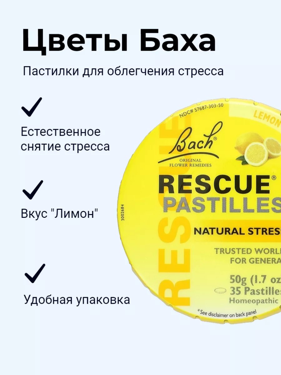 Bach Original Flower Remedies Цветы Баха, Снятие стресса, Rescue pastilles, Лимон, 50 г
