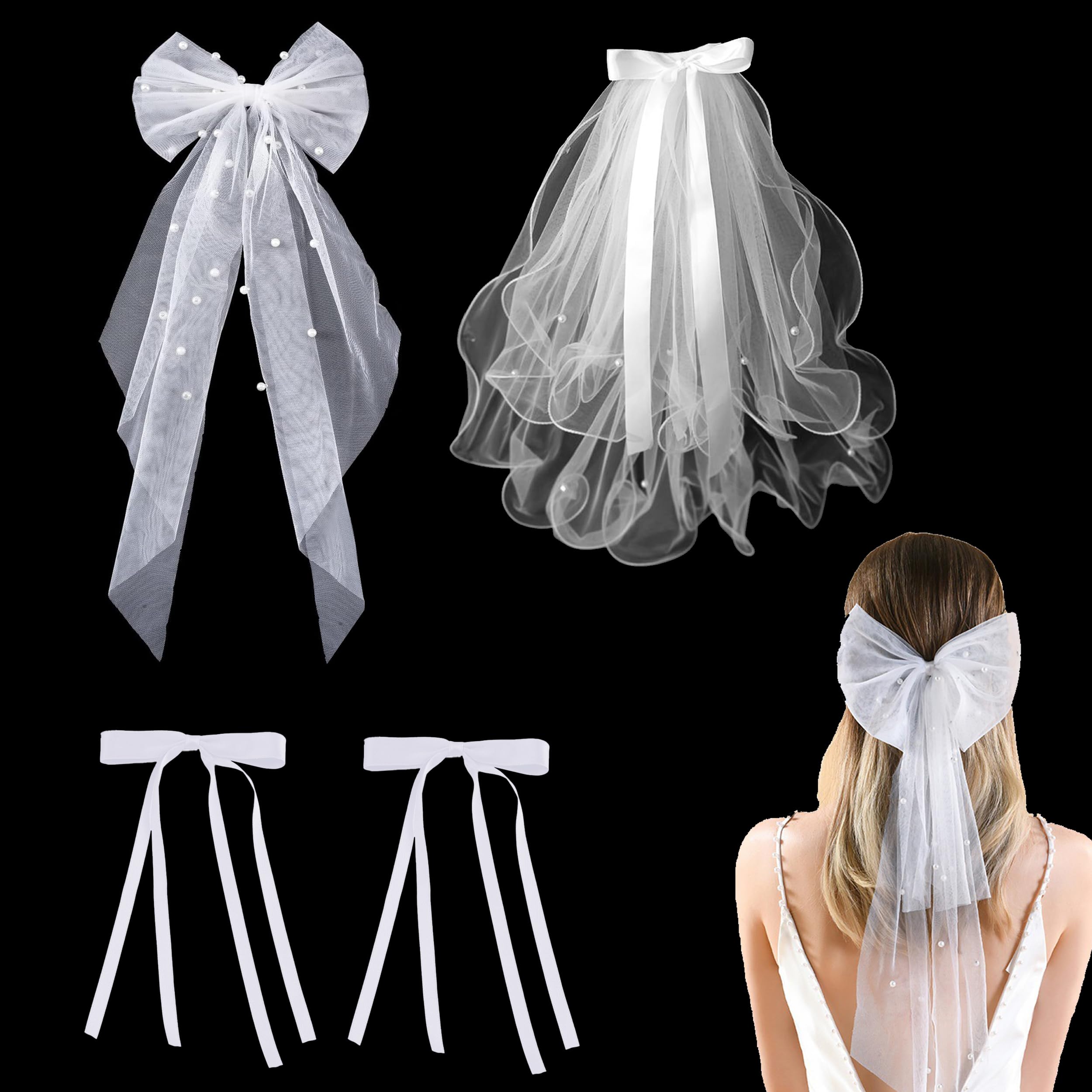 Bachelorette Bow Veil for Bride 2Pcs White Tulle Veil Barrette and 2Pcs Bow Hair Clips Pearl Wedding Veil Bridal Bow Veil Bachelorette Party Supplies Wedding Party Decorations for Women