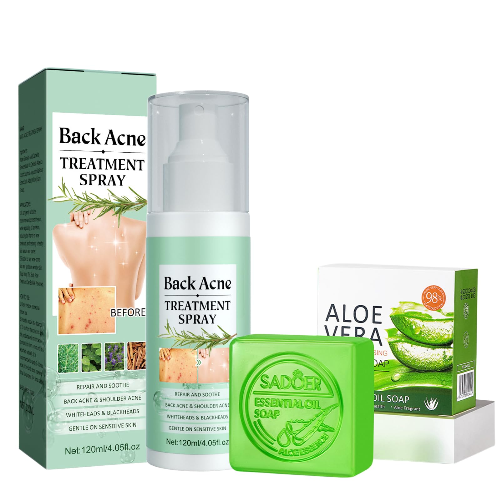 Back Acne Treatment Spray Aloe Bar of Soap Back Acne Treatment Spray Ingredients: AH_A, Camellia Sinensis Leaf Oil, Centella Asiatica and various herbal extracts which has the function of anti-inflammatory and pain-relieving. It can soften the acne skin, improve skin smoothness and gently exfoliating the acne area. Also help moisturize, repair the damaged skin, reactivate the skin cell and renew the skin. Aloe Face Soap Bath Soap Ingredients: Aloe extract, betaine, glycerin and variety of moisturising ingredients. Features: 1. Suitable for sensitive skin. 2. Gently cleaning skin, exfoliates dead skin cells and pore-clogging oil, pore minimizer. 3. Decongests, cleanses and refines the pores, kills bacteria, reduces mites. 4. Exfoliator repairs damaged skin and soothes redness and inflammation associated with acne. 5. Regulates oil secretion to reduce new acne from appearing, balances, soothes and hydrates skin. 6. Comes in a spray form and quick-absorbing formula to help the acne treatment penetrate into the skin more easily. How To Use: 1. Using our soap clean and dry the acne-prone area. 2. Place the nozzle 15cm away from the back acne, and apply this product in the form of a mist on acne-prone skin until it is naturally absorbed. 3. If you have body acne, it is advised that you spray 2-3 times each day. 4. Keep using it until it gone. Specifications: Contain: Back Acne Treatment Spray 1 Aloe soap bar 1 For Skin Types: Normal, Oily, Dry and Acne Prone Works For: clogged pores, pimples, zits, blackheads, bumps, redness, etc DIRECTIONS 1. Using the soap, clean and dry the acne-prone area. 2. Place the nozzle 15cm away from the back acne, and apply the back acne treatment spray in the form of a mist on acne-prone skin until it is naturally absorbed. 3. If you have body acne, it is advised that you spray 2-3 times each day. 4. Keep using it until the acne is gone. SAFETY WARNING no See more?Suitable for All Skin Types?Aloe natural soap Back Acne Treatment Spray is suitable for any acne-producing skin, and gentle on sensitive skin. Acne scar treatment visibly reduces pore size minimizes breakout, blackheads bumpy skin without irritation. Keep using this body acne treatment to be great prevention. ?Gently Restoration and Hydrates Skin?Spot treatment is a unique and leave-on body acne cure that gently exfoliates and moisturizes skin, while regulating the secretion of oil decreg chances of breakouts, reducing mites, restoring healthy skin texture and barrier. ?Powerful Ingredients Make Skin Radiant?Castile Soap contains 98 organic aloe vera extract and variety of moisturising ingredients. Back acne spray with Camellia Sinensis Leaf Oil, Centella Asiatica and various herbal extracts, which helps to relieve itching symptoms, eliminate bacteria and viruses on the surface, and skin tag removal patches heal injured wounds. The dots for spots spray is easy to apply on large and hard to reach areas, makes sure you enjoy no pimple skin from neck to toe. ?Deep Cleaning?Our combination can be used on face and body. Antibacterial soap effectively cleans oil and dirt, its foam is rich and cotton-soft, it is very comfortable to wash your face and body. The blackhead remover gets to the root cause of back acne as it deeply cleanses the pores, kills bacteria, gently exfoliates, and regulates oil secretion while keeping skin balanced, nourished, and protected in just a few sprays. ?Super Combination Reduce Body Face Acne?Aloe acne soap has moisturising, antioxidant, antibacterial and anti-inflammatory properties. Body soap gives your skin a gentle cleanse. After cleaning your face and body, Use our back acne treatment spray, It specifically targets stubborn acne on the body, reduces the accumulation of sebum that forms acne, effectively clears skin acne.