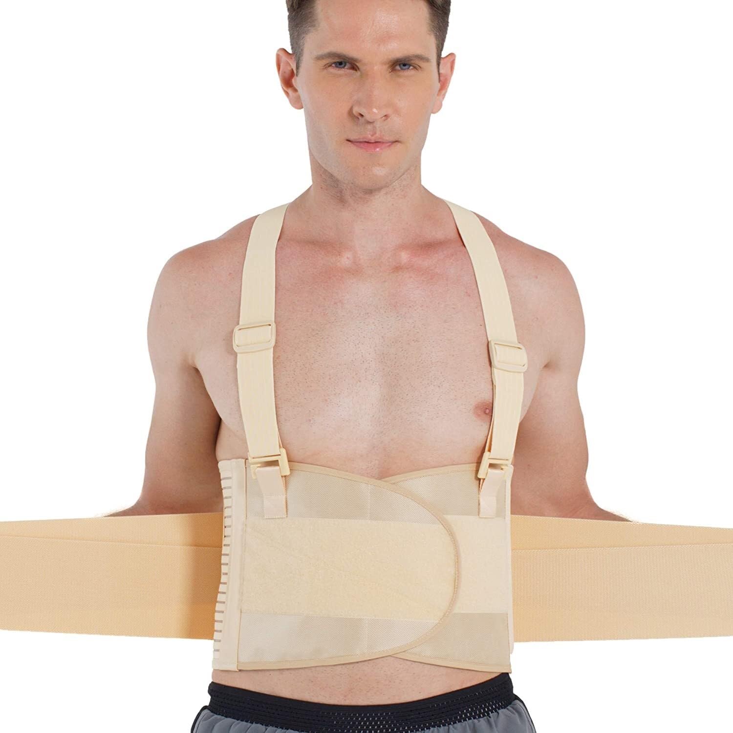 Back Brace With Adjustable Removable Shoulder Straps, Men Women Back Support Lumbar Spine Decompression Belt For Lower Back Pain Relieve, Work, Lifting, Exercise Package Include: 1 Piece * Work Back Brace Belt Size Chart: M (belly: 30-34" / 76-86cm), L (belly: 33-36" / 84-91cm), XL (belly: 35-38" / 89-96.5cm), XXL (belly: 38-41.5" / 96.5-105cm). Width of 22 cm for all sizes. NOTE: When measuring size please measure around the area where you will put the belt (usually around the belly button) Specifications: ?Name: Back Brace Support Belt ?Material: All elastic fabric ?Color:Black , Skin ?Size: M, L, XL,XXL ?Suit for: Adult Men, Women, Older People ?Applicable Scene: Work, Football, Soccer, Basketball, Volleyball, Tennis, Badminton, Golf, Climbing, Mountaineering, Hiking, Cycling, Running,Sports Fitness and so on The lumbar support back brace is great for: 1. The people who are involved in heavy work like weight lifting. 2. The people who are always sitting in front of the computer or doing the daily chores. 3. The older people who need support or feel painful on their back or waist How does the lumbar support back brace work? 1. The back brace offer the strong compression to the back and waist to get a strong support and posture correct 2. The degree of tightness can be adjusted by the velcro staps or the adjustment buckle to give you the perfect wearing experience. See more?It is made of a deluxe mesh, high-elasticity nylon fabric and also has PP stripes distributed evenly in order to disperse the force the vertebrae undertake. ?Prevent & treat: Helps lessen lumbar strain, ease existing chronic back pain, prevent further damage from overuse, encourage proper lifting techniques, and develop better back posture for working and sitting. ?Ideal for industrial use: Double-pull tension straps and flexible posterior stays provide superior lower back and abdominal support for occupations including construction, landscaping, bricklaying, and movers. ?Adjustable & detachable suspenders: Removable, criss-cross suspender straps provide additional support and can be easily adjusted, making it completely customizable. ?Breathable & low-profile fit: Made of a premium-quality elastic, making it comfortable to wear while working or weightlifting. Comes in black and skin tone, it can be worn over or under clothing.