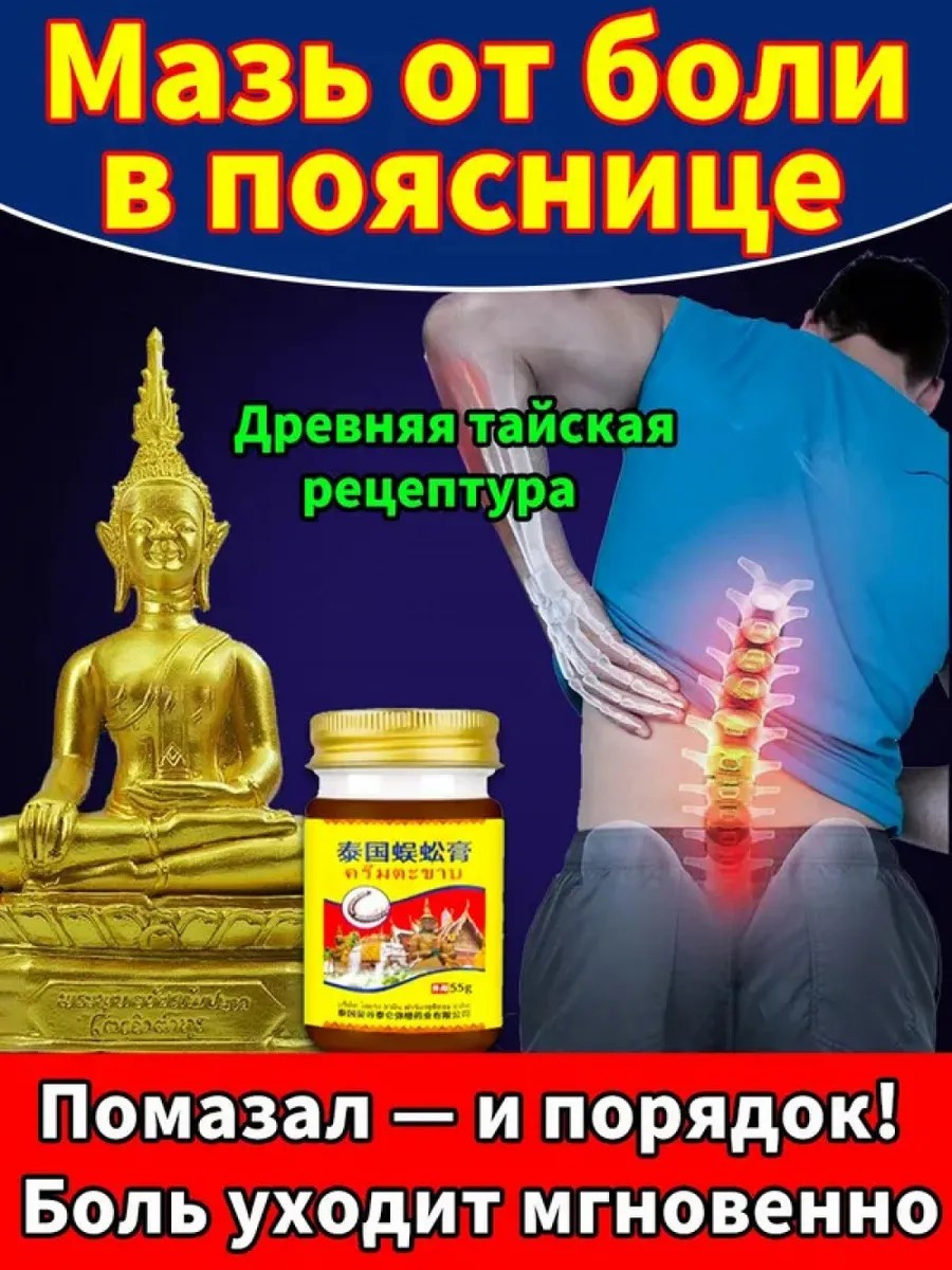 Избавьтесь от боли в спине с проверенным тайским средством! Мгновенное обезболивание – быстро снимает дискомфорт в пояснице . Уменьшает воспаление – помогает при грыжах и протрузиях . Улучшает кровообращение – способствует восстановлению межпозвонковых дисков . Натуральный состав – ментол, камфора и целебные травяные экстракты Почему выбирают нашу мазь? Подходит взрослым и детям (детский вариант доступен отдельно). Водонепроницаемая формула – не оставляет следов на одежде . Медицинский эффект без побочных действий . Альтернатива корректорам осанки и лечебным пластырям Как применять: Очистите кожу в области поясницы Нанесите небольшое количество мази Аккуратно вотрите круговыми движениями Используйте 2-3 раза в день Состав: Натуральные компоненты без клея и химических добавок. Аналог лечебных пупочных пластырей, но в удобной форме мази. Противопоказания: Не наносить на открытые раны. При пупочных грыжах у детей требуется консультация врача. Внимание! Эта мазь – не лейкопластырь, а полноценное лечебное средство. Эффективнее обычных ушных и пупочных корректоров! Объем: 55 мл Производство: Таиланд Закажите сейчас и забудьте о боли в позвоночнике! Ваша поясница скажет вам "спасибо".