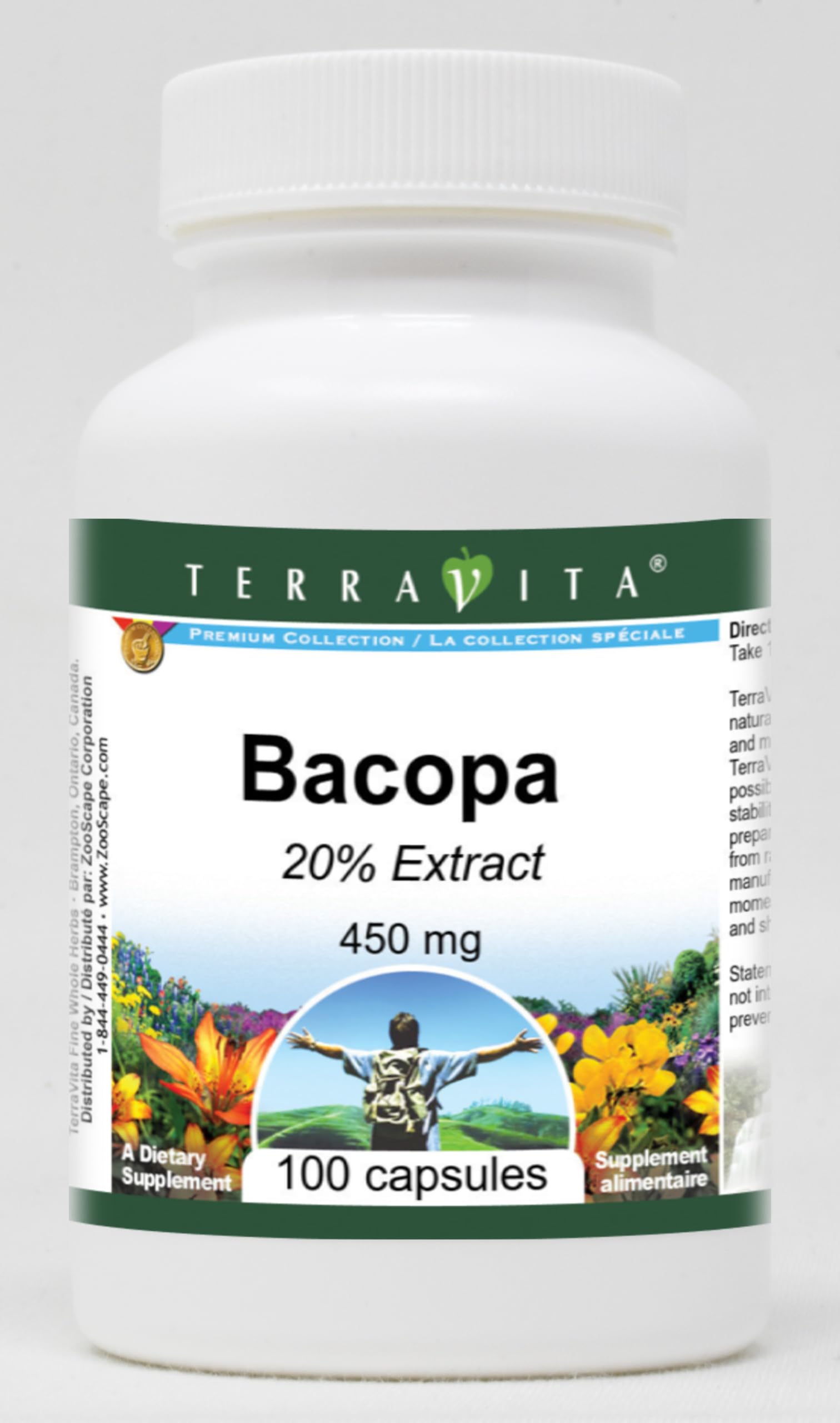 Bacopa 20 - 450 mg (100 capsules, ZIN: 519222) Packaged in the United States in a GMP certified facility (Good Manufacturing Practice). No fillers. Manufacturer: TerraVita Size: 100 capsules Easy-to-swallow Capsules in a sealed bottle. Ingredients: Gelatin, Water, Bacopa 20 Extract - 450 mg