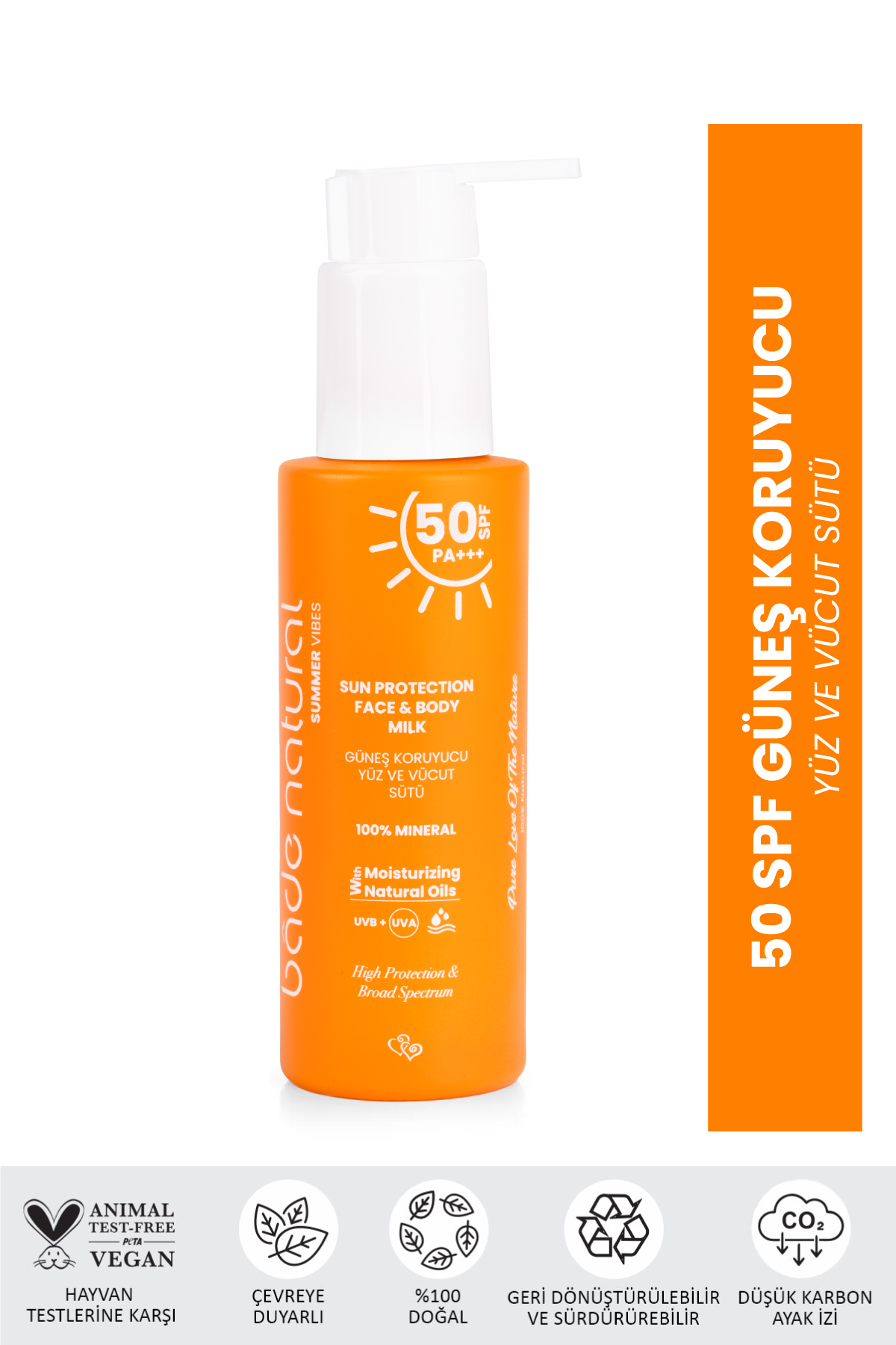 Bade Natural 50 SPF Sunscreen Face and Body Milk reflects sunlight with the mineral filter zinc oxide it contains, protects the skin from the harmful rays of the sun with natural vegetable oils, and provides high broad-spectrum protection against UVA and UVB with its SPF 50 value.
