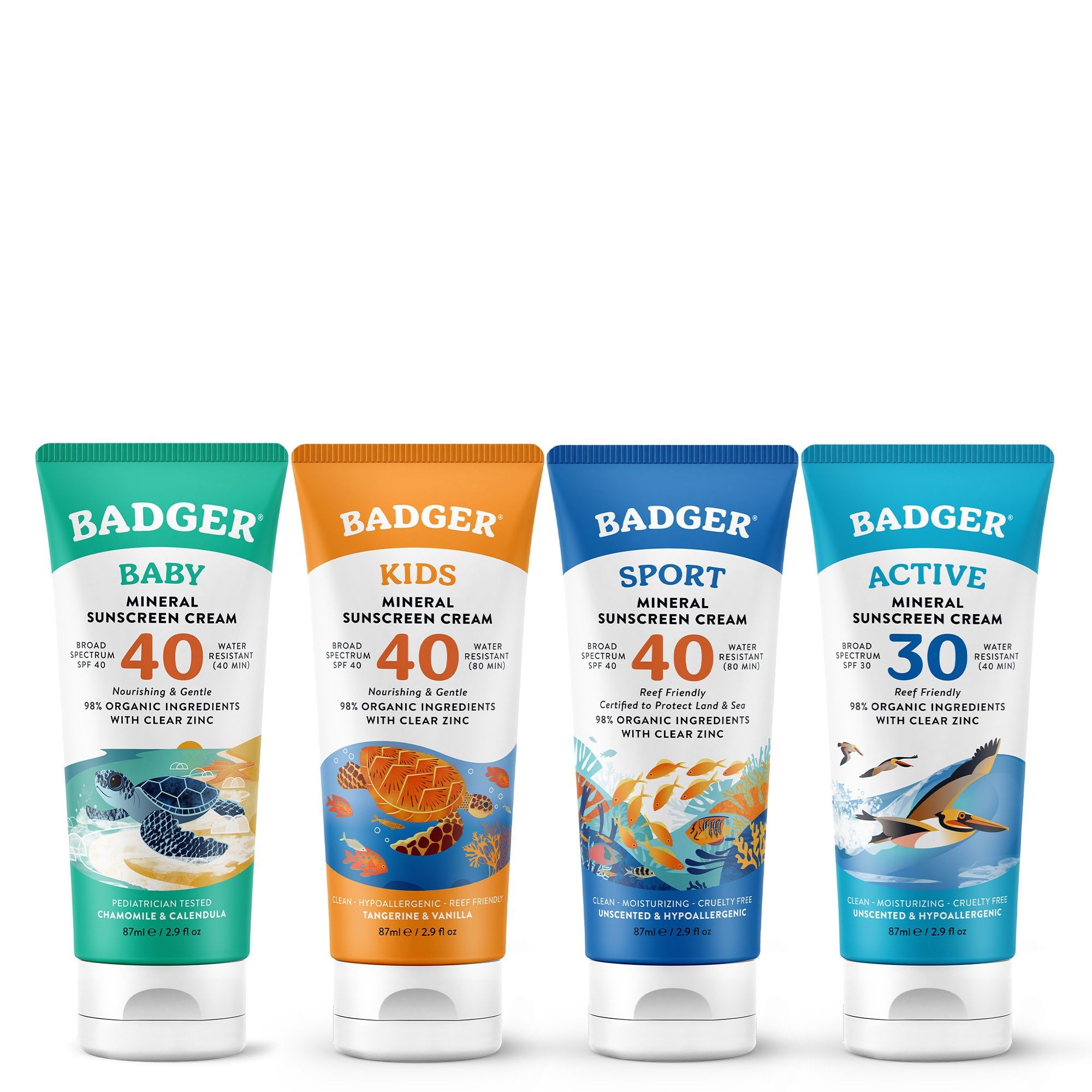 REEF FREINDLY REEF SAFE SUNSCREEN: No oxybenzone or any chemicals that harm coral reefs. Hawaii and Mexico approved travel sunscreen! Safe for reefs means safe for you. SPF 30 DAILY SUNSCREEN: Light sunflower based, easy to apply, face and body sunscreen. 40 minutes sweat water resistant keeps you protected during outdoor activities. SPF 40 SPORT SUNSCREEN: Help prevent sunburn and skin damage with mineral zinc oxide sunscreen with broad spectrum UVA UVB protection. Hypoallergenic non-comedogenic. Gentle on sensitive skin. SPF 40 KIDS SUNSCREEN: Protect your children from sunburn and skin damage with a zinc oxide sunscreen with broad spectrum UVA UVB protection. Gluten free non-GMO. SPF 40 BABY SUNSCREEN: Protect your baby from sunburn and skin damage with a UVA UVB broad spectrum zinc oxide sunscreen, the same safe ingredient in diaper cream and calamine lotion.
