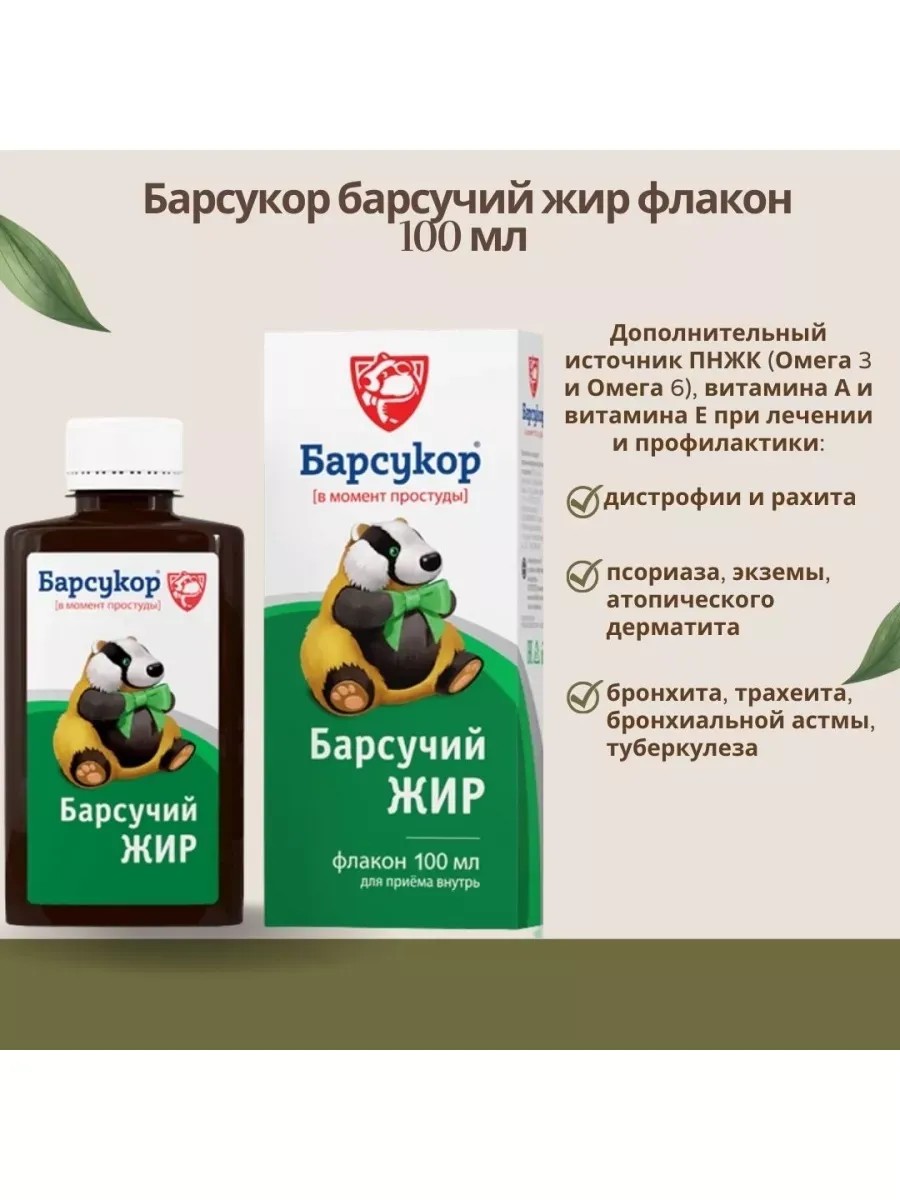 БАД Барсучий жир рекомендуется в качестве дополнительного источника ПНЖК (Омега 3 и Омега 6), витамина А и витамина Е при лечении и профилактики дистрофии и рахита; бронхита, трахеита, бронхиальной астмы, туберкулеза; псориаза, экземы, атопического дерматита. Барсучий жир обладает муколитическим действием, эффективен для профилактики (в комплексной терапии) воспалительных заболеваний дыхательных путей, оказывает общеукрепляющее действие, рекомендуется применять для профилактики ОРВИ и гриппа, сокращает продолжительность заболевания и способствует укреплению иммунитета, способствует снижению интенсивности инфекционно-воспалительного процесса, способствует заживлению ран. БАД обеспечивает суточную потребность организма в ПНЖК на 18,2%, в ПНЖК Омега-3 - на 42,9%, в витамине Е - на 20%. СПОСОБ ПРИМЕНЕНИЯ И ДОЗЫ: взрослым и детям старше 14 лет принимать по 1 чайной ложке (5 г) 2 раза в день во время еды. Перед употреблением взболтать содержимое флакона. Продолжительность приема - 1 месяц. При необходимости прием продукта можно повторить.