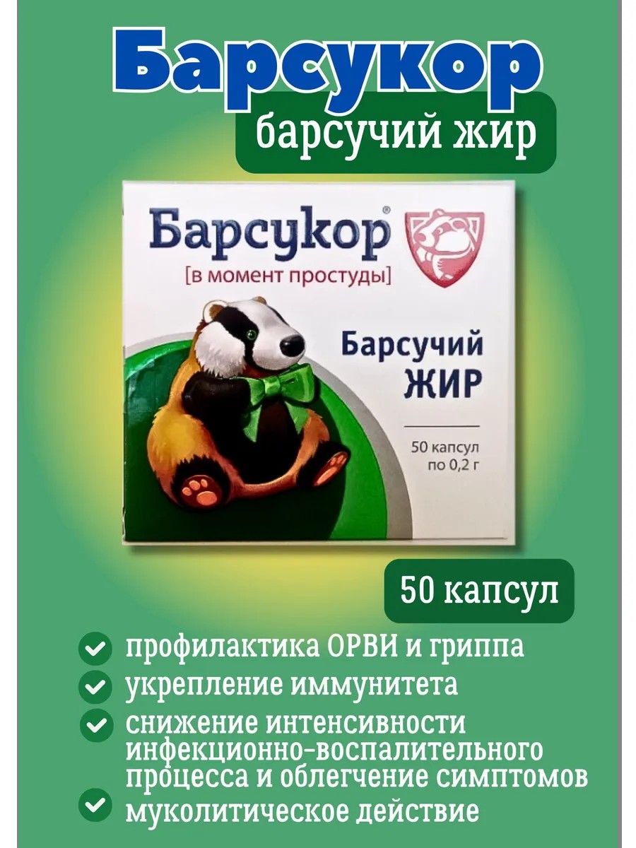 Барсучий жир барсукор - это биологически активная добавка (БАД) к пище - натуральный продукт, топленный барсучий жир в капсулированном виде. Капсулированная форма Барсукор не имеет запаха и вкуса, что упрощает пероральный прием барсучьего жира. Он богат витаминами А, Е, омега-3 жирными кислотами. Все эти компоненты прекрасно дополняют друг друга. Например, витамин А (ретинол) и витамин Е (токоферол) усиливают действия друг друга, а их совместное применение эффективнее раздельного. Токоферол также предупреждает окисление витамина А, улучшает его усваиваемость. В свою очередь Витамины А и Е являются антиоксидантами клеточных мембран, содержащих ПНЖК. Барсучий жир обладает муколитическим действием, эффективен для профилактики (в комплексной терапии) воспалительных заболеваний дыхательных путей, оказывает общеукрепляющее действие.Рекомендуется применять для профилактики ОРВИ и гриппа. Сокращает продолжительность заболевания и способствует укреплению иммунитета. Способствует снижению интенсивности инфекционно-воспалительного процесса.В упаковке 50 штук капсул, массой по 0,2 грамма каждая. Взрослым принимать 12 капсул 4 раза в день во время еды. Продолжительность приема – 1 месяц. При необходимости прием продукта можно повторить. Этот продукт может быть особенно полезен людям, кто желает укрепить свой иммунитет и улучшить свое здоровье. Перед применением рекомендуется проконсультироваться с врачом.
