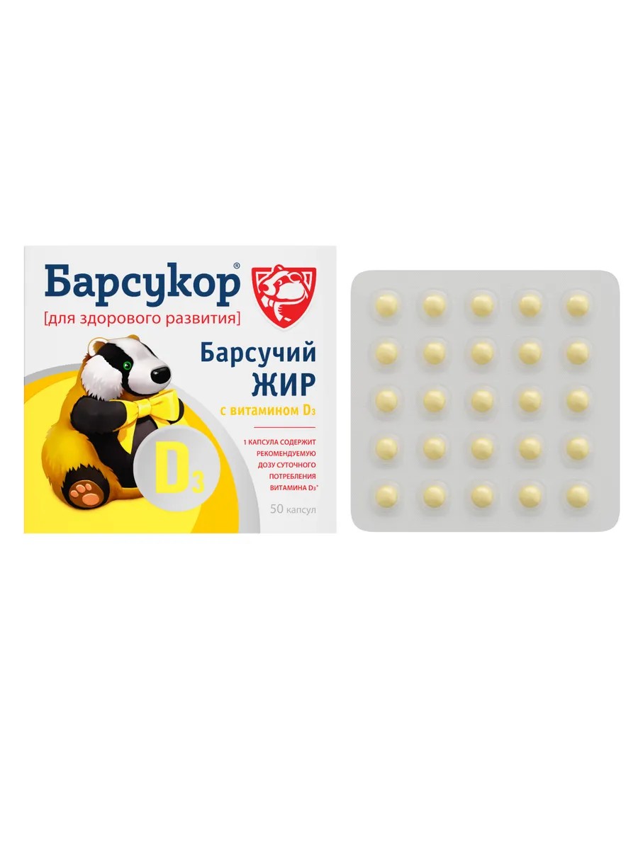 | Комплектация | БАРСУКОР барсучий жир с витамином Д3 капсулы, 0,2 г 50 шт - 1 шт |