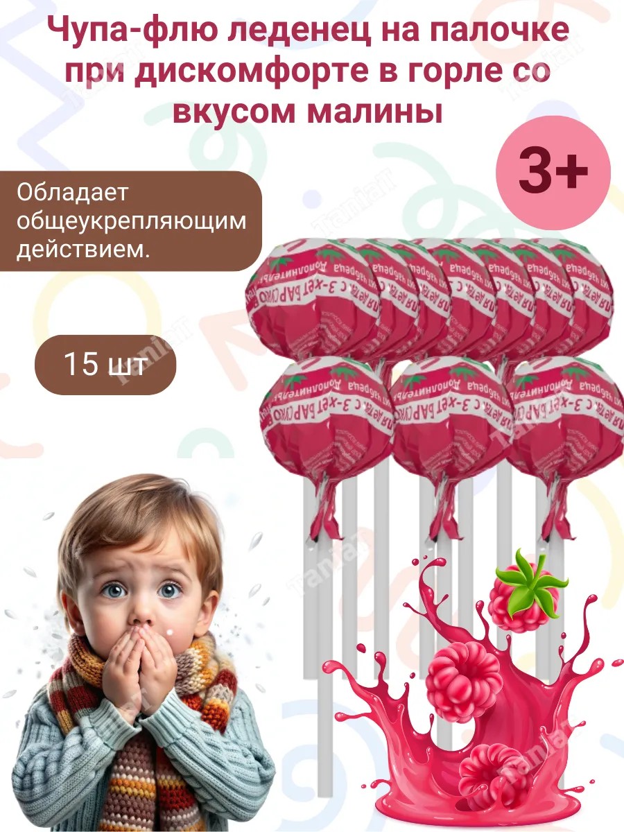 «Чупа-Флю» Леденец на палочке при дискомфорте в горле со вкусом малины.