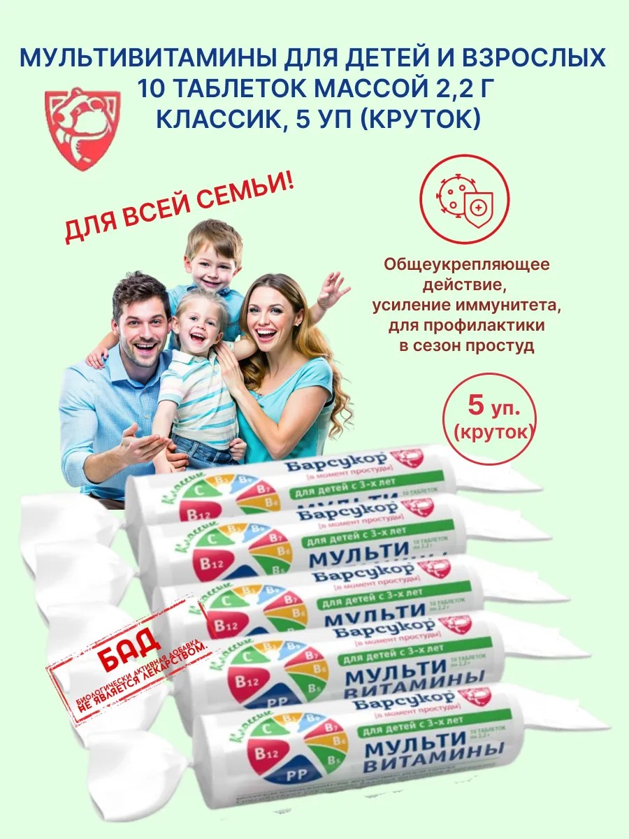 Барсукор Мультивитамины для детей и взрослых 10 табл, 5 уп (круток)