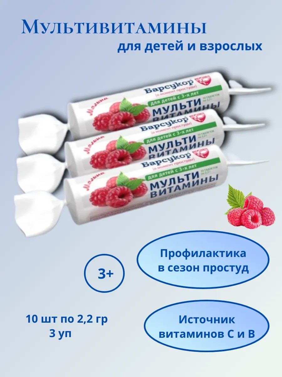 | Комплектация | Барсукор мультивитамины для детей и взрослых с малиной 10 табл * 2,2г; 3 уп |