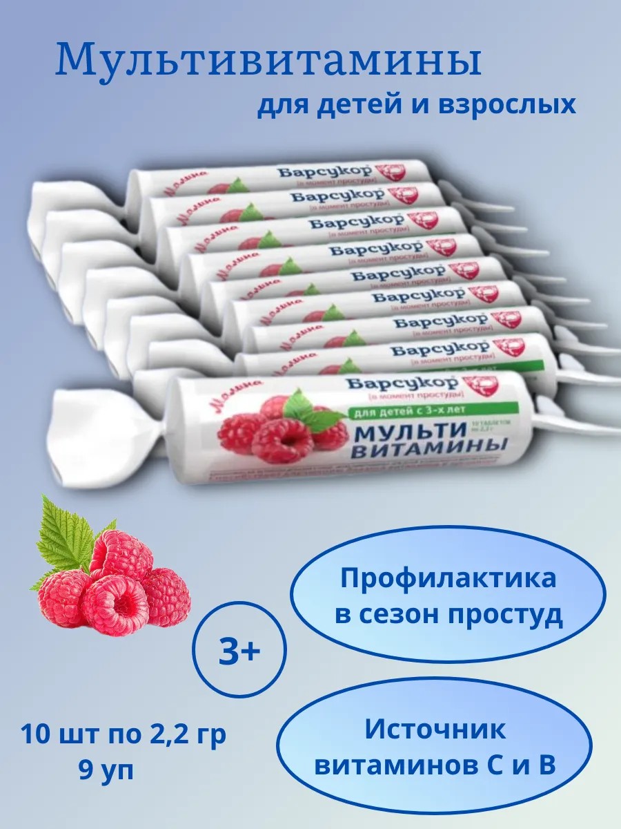 | Комплектация | Барсукор мультивитамины для детей и взрослых с малиной 10 табл * 2,2г; 9 уп |