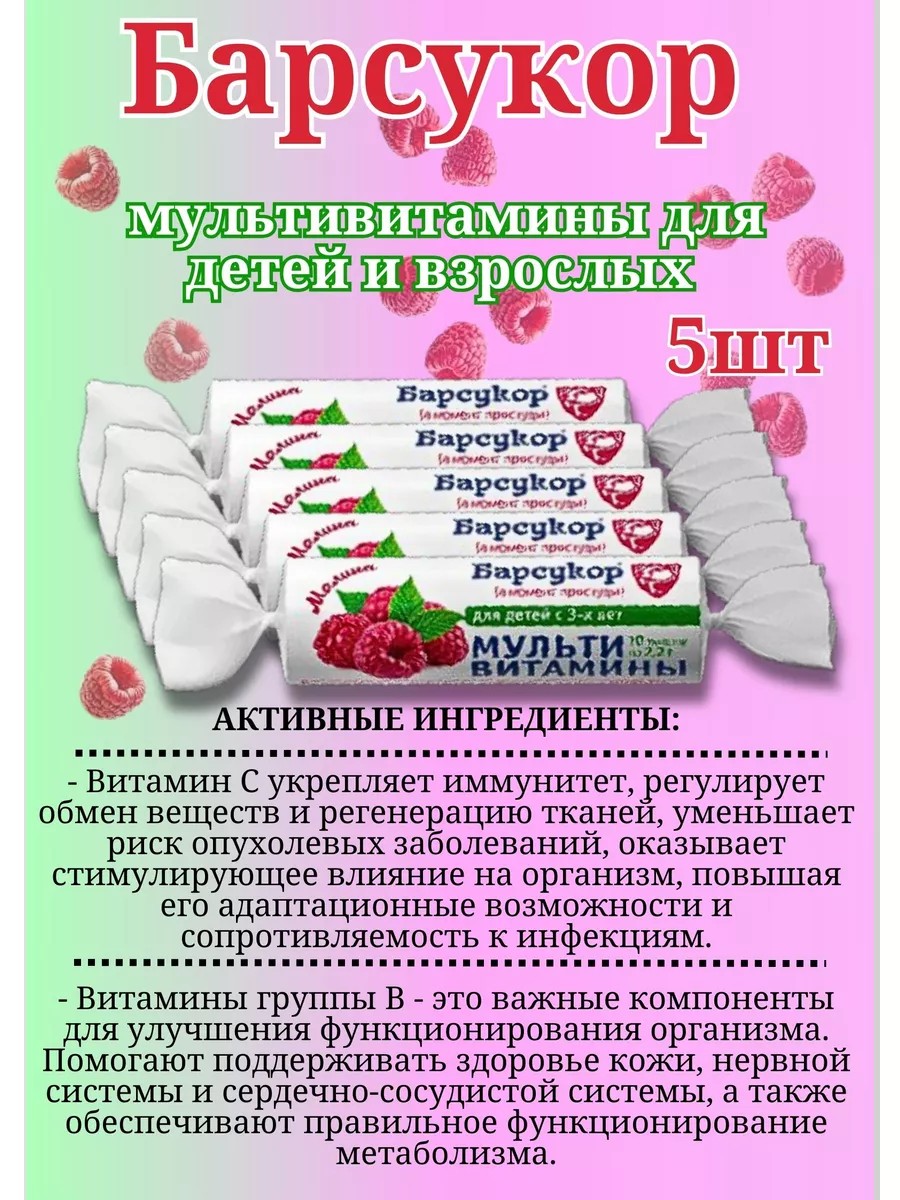 БАРСУКОР Витамины для детей 3 лет и взрослых в таблетках малина