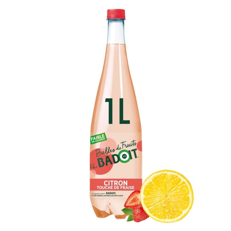 St Alban's carbonated natural mineral water (88 ), fruit juice from concentrate 7 (lemon 4 , strawberry 2.5 , lime 0.5 ), sugar (4.6 ), natural flavorings, acidifier: citric acid, sweet potato and radish extract.Fruit Bubbles Lemon Touch of Strawberry 1L. BADOIT. Flavored Waters. Waters. Drinks. Eau minérale naturelle gazéifiée de St Alban (88 ), jus de fruits à base de concentré 7 (citron 4 , fraise 2,5 , citron vert 0,5 ), sucre (4,6 ), arômes naturels, acidifiant: acide citrique, extrait de patate douce et de radis.Bulles De Fruits Citron Touche De Fraise 1L. BADOIT. Eaux aromatisées. Eaux. Boissons.