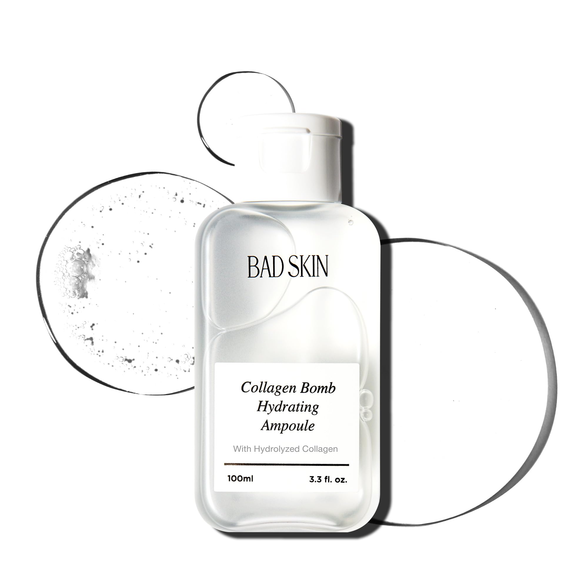 K-Beauty Bestseller from Korea – A long-loved Korean hydrating ampoule trusted for over 5 years in Korea, with 13,000 reviews on Hwahae (Korea's leading beauty app) and 10,000 reviews on Naver Olive Young, reflecting strong consumer trust. SOOTHING MOISTURE BARRIER CARE : Formulated with botanical extracts including Green Tea Leaf, Licorice Root, Rooibos, and Broccoli Extract to help calm dry or sensitive skin while improving overall skin condition and hydration balance. KEY INGREDIENTS – COLLAGEN HYALURONIC COMPLEX : Contains Hydrolyzed Collagen (8,589 ppm) to support skin hydration and help maintain a firm, smooth-looking complexion. Combined with Hyaluronic Acid Complex and Glycosaminoglycans to retain moisture and support the skin's natural moisture barrier. COLLAGEN BOMB HYDRATING AMPOULE 400ml : A large-size hydrating ampoule (400ml) designed for intensive daily moisture care. The lightweight, fast-absorbing formula delivers deep hydration without heaviness or stickiness, making it suitable for face and neck daily use. BAD SKIN is a Korean skincare brand dedicated to essential skincare solutions that focus on deep hydration, skin balance, and long-lasting comfort. We develop products with carefully selected ingredients and proven performance for everyday skin care.