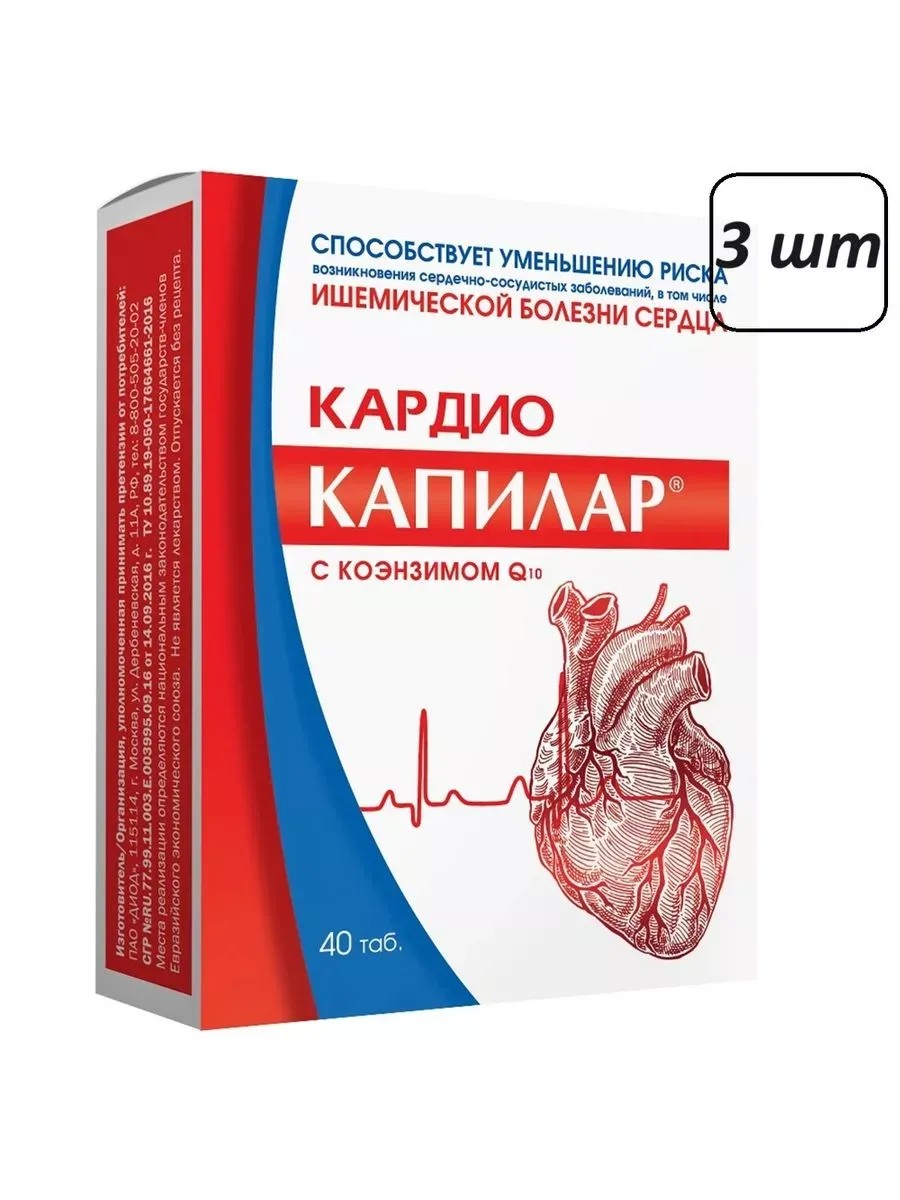 Кардио капилар с коэнзимом Q10 - это биологически активная добавка, разработанная для поддержания здоровья сердечно-сосудистой системы. Препарат содержит комплекс натуральных ингредиентов, в том числе витамин С, дигидрокверцетин, коэнзим Q10, органический селен , которые помогают укреплять стенки кровеносных сосудов, улучшать кровообращение и снижать риск сердечных заболеваний. Кардио-капилар с коэнзимом Q10 рекомендуется применять для улучшения фукционального состояния сердечной мышцы и сердечно-сосудистой системы в целом . Упаковка содержит 40 таблеток, рекомендуемая дозировка - по 1 таблетке 3 раза в день во время еды. Перед использованием рекомендуется проконсультироваться с врачом.