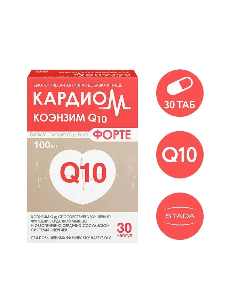 КАРДИОМ КОЭНЗИМ Q10 ФОРТЕ (CARDIOM COENZYME Q10 FORTE) - Биологически активная добавка (БАД) к пище - способствует защите клеток сердца и сосудов и обеспечению сердечно-сосудистой системы энергией. При повышенных физических нагрузках.• Мощный антиоксидант, обогащает сердце кислородом и замедляет старение сердца и сосудов;• Способствует нормализации кровообращения и сократительной функции сердца;• Способен снижать показатели усталости, увеличивая работоспособность.