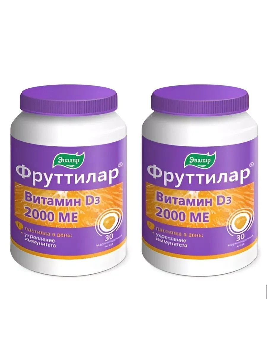 ФРУТТИЛАР Витамин D3 2000 МЕ – это биологически активная добавка к пище (БАД). Содержит 2000 МЕ витамина D3 в 1 пастилке по 4 грамма каждая. Для тех, кто хочет не только получать от витамина D3 пользу, но и порадовать себя приятным вкусом. Фруттилар Витамин D3 способствует укреплению иммунитета и снижению риска развития простудных заболеваний, лучшему усвоению кальция, укреплению костей, зубов, снижению риска развития остеопороза, повышению силы мышц, поддержанию сердечно-сосудистой и нервной систем, регуляции репродуктивной функции организма, повышению уровня серотонина – «гормона счастья» и улучшению настроения. В изготовлении мармеладной основы используются натуральные пищевые компоненты: сахар, желатин (источник коллагена) и патока. Не требуют запивания. Взрослым — по 1 жевательной пастилке в день. Продолжительность приема — 2–3 месяца. Перед применением рекомендуется проконсультироваться с врачом.