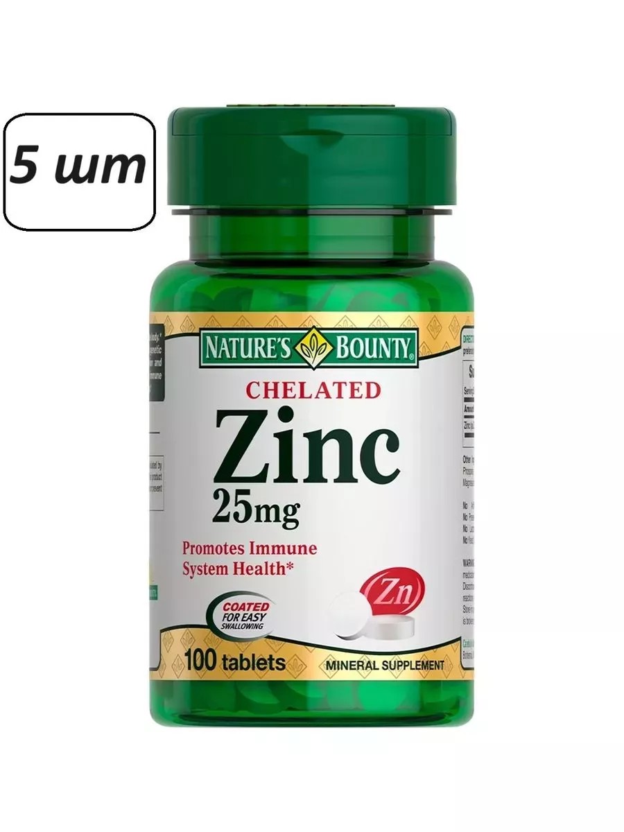 Нэйчес баунти хелат цинка 25 мг - это биологически активная добавка к пище, применяемая в качестве дополнительного источника цинка.Цинк выполняет в организме множество различных функций. В частности, достаточное поступление цинка помогает укрепить иммунную систему и поддержать ее работу на должном уровне, чтобы минимизировать риск простудных заболеваний. Цинк регулирует работу сальных желез, что важно для людей с проблемной и жирной кожей. Недостаток цинка может быть причиной угревой сыпи. Цинк играет важнейшую роль в процессах регенерации кожи, волос, ногтей. Также цинк поддерживает и укрепляет мужское здоровье. Он участвует в процессах сперматогенеза и синтеза тестостерона. Перед применением рекомендуется проконсультироваться с врачом.
