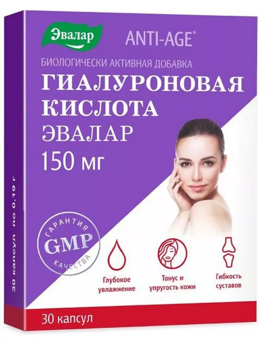 Глубокое увлажнение кожи изнутри. Максимум гиалуроновой кислоты швейцарского производства - 150 мг в каждой капсуле. Примерно до 25 лет в организме вырабатывается достаточное количество гиалуроновой кислоты, но с возрастом ее синтез постепенно начинает снижаться. Недостаток гиалуроновой кислоты по-разному проявляется в нашем организме. Прежде всего, страдает внешний вид нашей кожи, особенно лицо. Здесь гиалуроновая кислота выполняет две важнейшие функции: поддержание объема и естественное увлажнение. Заполняя пространство между волокнами коллагена, которые образуют -каркас- нашей кожи, гиалуроновая кислота поддерживает контур лица. Ее нехватка в клетках кожи приводит к тому, что со временем вокруг носогубного треугольника образуются складки, опускаются уголки губ, сами губы становятся тоньше. Попытки восстановить нормальный уровень влажности кожи исключительно с помощью наружных косметических средств не всегда бывают успешными, так как проблема кроется именно в недостатке гиалуроновой кислоты внутри организма.