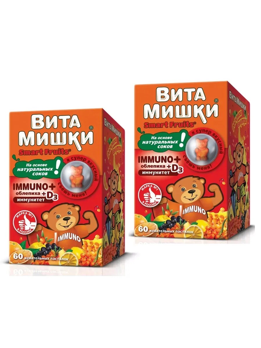 Линия биокомплексов ВитаМишки - вкусные детские витамины №1 в России - жевательные мармеладные мишки на основе натуральных соков.ВитаМишки Immuno + облепиха - сбалансированный витаминно-минеральный комплекс в виде вкусных мармеладных пастилок-мишек с натуральными фруктовыми и овощными экстрактами для детей с 3-х лет.• Снижает риск развития простудных заболеваний.• Способствует укреплению иммунитета.• Способствует ускорению процесса выздоровления.Жевательные пастилки с апельсиновым, персиковым, виноградным и лимонным вкусом.