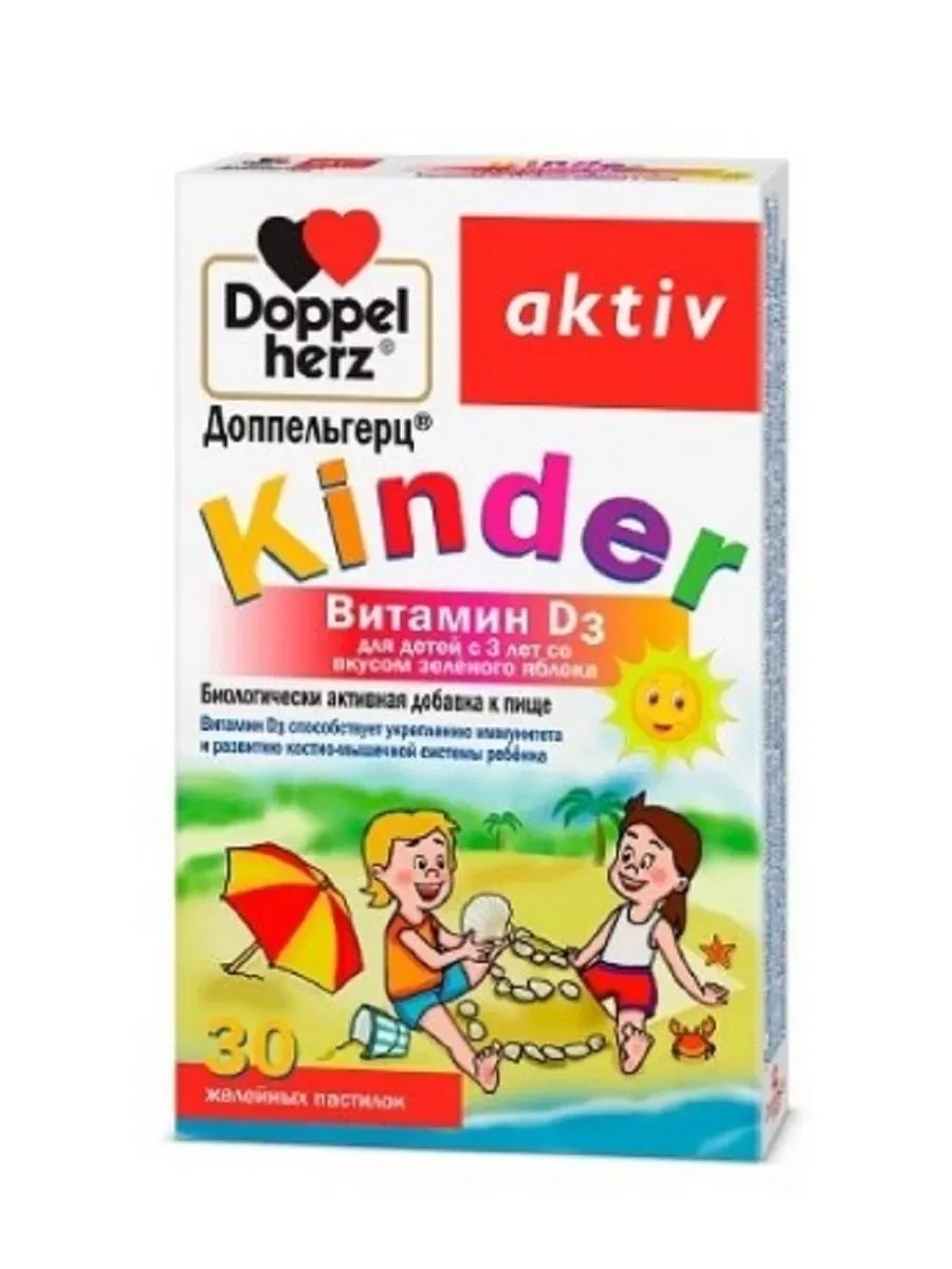 Doppelherz Kinder Vitamin D3 - витаминный комплекс в форме желейных конфет с зеленого яблока для детей от 3 лет. Пастилки содержат 1500 мг витамина D3, который необходим для поддержания здоровья костей, иммунной и сердечно-сосудистой системы. Вкусные и удобные в приеме желейки Doppelherz Kinder Vitamin D3 позволят ребенку получить необходимую дозу витамина без труда. Комплекс прошел все необходимые проверки и рекомендуется педиатрами.