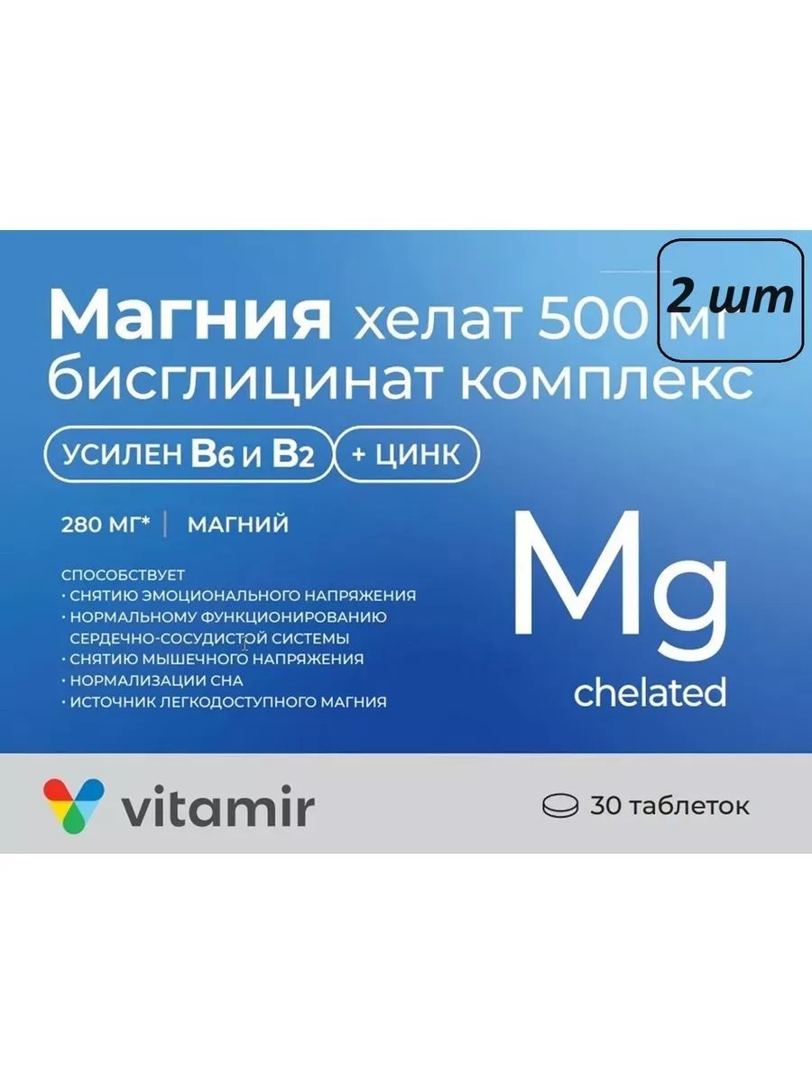 Магния хелат (бисциглинат) - это биологически активная добавка (БАД) к пище - комплексный препарат, который содержит в себе магний, витамины и цинк. Каждая таблетка содержит 500 мг магния хелата (бисглицината). Одной из главных задач магния является защита нервной системы от различных стрессов. Он тормозит избыточное возбуждение нервных клеток в головном мозге и помогает устранить раздражительность и тревожность, снизить чувствительность организма к неблагоприятным внешним воздействиям. Данный препарат используется для укрепления костей, нормализации сердечного ритма, улучшения функции нервной системы и иммунитета. Также он уменьшает риск развития аритмии и инфаркта миокарда. В составе Магния хелат (бисциглинат) 500 мг ещё присутствуют витамины B6 и В2. Данные витамины влияют на состояние нервной системы, кожи и слизистых оболочек; обеспечивают более полное усвоение магния и его сохранение в клетке, способствуют нормализации деятельности нервной системы, помогают улучшить сон. Также препарат содержит цинк, который является важным компонентом, благодаря которому реализуется активность множества различных ферментов. Присутствие ионов цинка необходимо в процессах метаболизма питательных и минеральных веществ. Кроме того, он входит в состав гормона поджелудочной железы инсулина и участвует в образовании данной молекулы. Магния хелат (бисциглинат) 500 мг помогает сохранить здоровье и энергию на весь день.