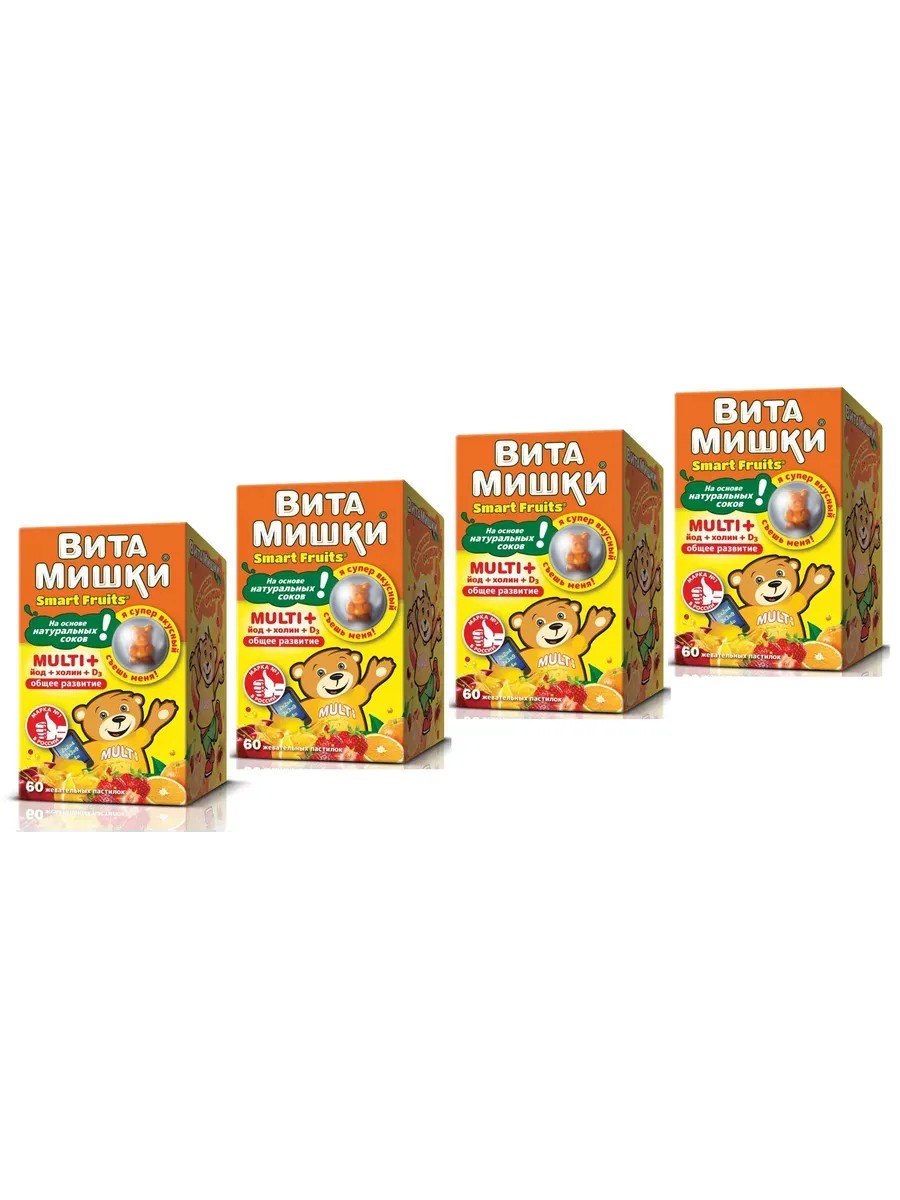 Линия биокомплексов ВитаМишки - вкусные детские витамины №1 в России - жевательные мармеладные мишки на основе натуральных соков.ВитаМишки Multi+ йод и холин - сбалансированный витаминно-минеральный комплекс в виде вкусных мармеладных пастилок-мишек с натуральными фруктовыми и овощными экстрактами для детей с 3-х лет.• Оказывает общеукрепляющее действие.• Поддерживает организм при умственных и физических нагрузках.• Способствует интеллектуальному развитию ребёнка.