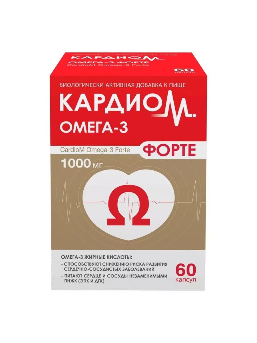 Торговое наименованиеБиологически активная добавка к пище «КардиоМ Омега-3 Форте / CardioM Omega-3 Forte». Форма выпуска: капсулы массой 1375 мг.