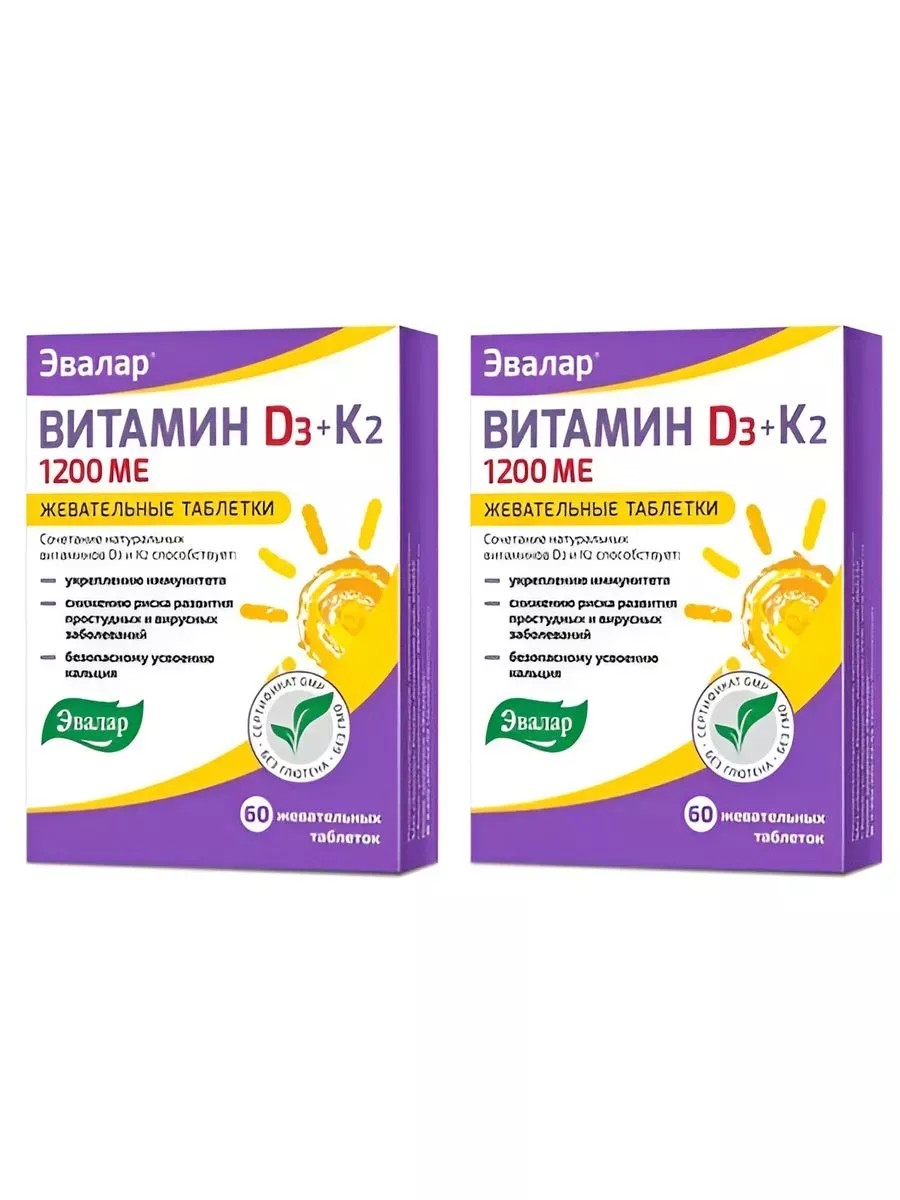 Evalar's Vitamin D3 1200 IU + K2 chewable tablets contain a high-dose natural vitamin D3 fortified with natural vitamin K2 in its most bioavailable form, MK-7. K2 complements the action of vitamin D and promotes its better absorption.