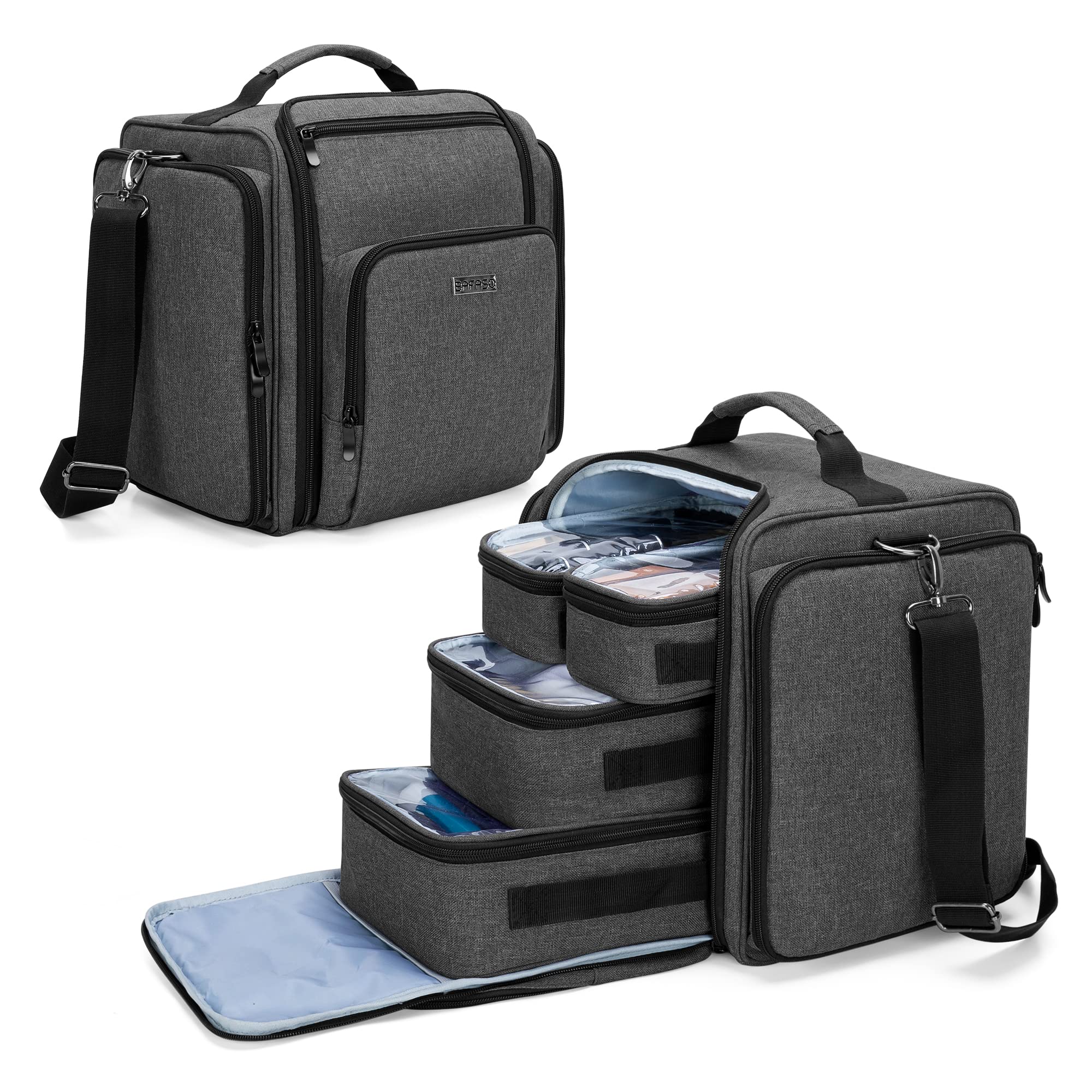 Simply portable: the shoulder strap and two stable handles have a high comfort.Dimension: 25.5 x 21 x 29cm.Practical structure: the rear bag and 2 side pocket for normal make -up set and skin care products.Ideal storage area: The side pocket is specially designed for brushes.The transparent zip pocket fits for normal large eyeshadow, powder and other flat make-up.(Cosmetic residues on transparent materials can be easily wiped off).Great capacity: The main subject has 4 removable transparent bags, you can organize and sort your make -up set well.The transparent material can be seen well what is in there and saves an annoying rummaging.Excellent quality: This car seat organizer is made of durable nylon.The padded inner lining offers good protection for make -up and beauty accessories.